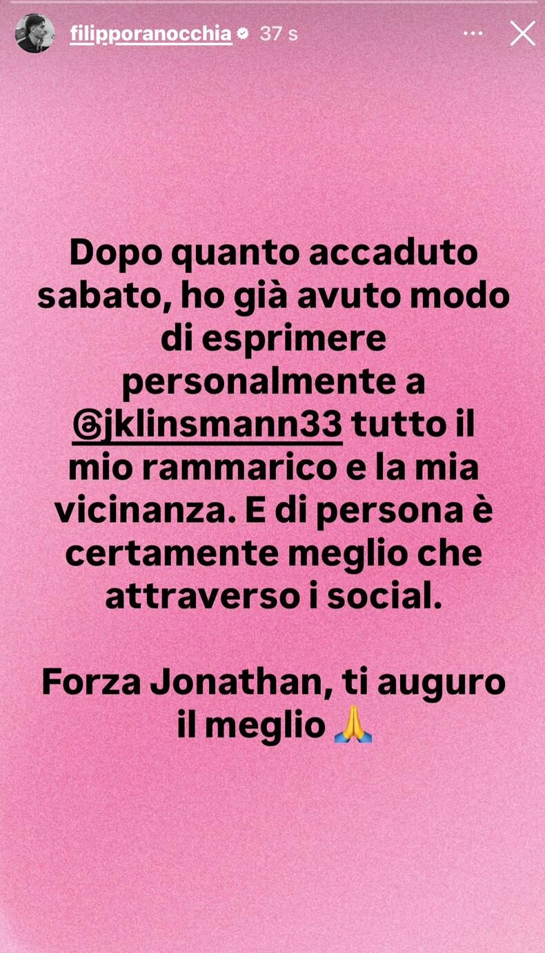 PALERMO – Dopo giorni di polemiche e preoccupazione per le condizioni di Jonathan Klinsmann, arriva il messaggio di Filippo Ranocchia. Il centrocampista del Palermo ha voluto esprimere pubblicamente la propria vicinanza al portiere del Cesena attraverso una storia su Instagram.