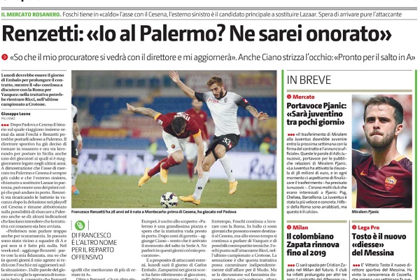 Intervistato ai microfoni de “Il Giornale di Sicilia”. Francesco Renzetti si è così espresso in merito all’interesse del Palermo nei suoi confronti: «Preferisco non parlare troppo anche per scaramanzia, in passato sono stato vicino a squadre di A e poi non si è fatto più nulla. Nel week end parto con la mia fidanzata ma so che in questi giorni il mio agente si vedrà con Foschi e mi aggiornerà sulla situazione. Sono onorato di ricevere l’interesse di una squadra come il Palermo. Ho seguito con attenzione la lotta salvezza – spiega l’esterno – e sono convinto che i rosanero fossero quelli che meritavano di più di restare in A»