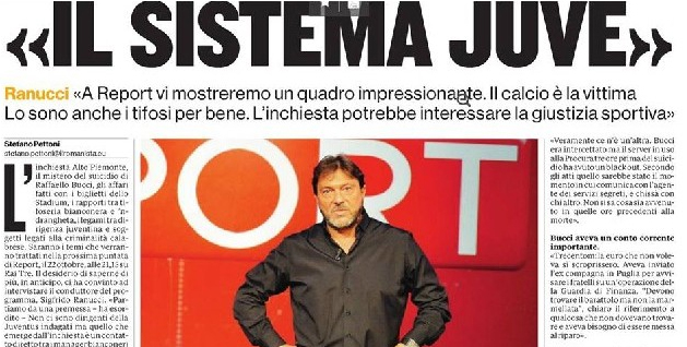 “L’inchiesta Alto Piemonte, il mistero del suicidio di Raffaello Bucci, gli affari fatti con i biglietti dello Stadium, i rapporti tra tifoseria bianconera e ‘ndrangheta, i legami tra dirigenza juventina e soggetti legati alla criminalità calabrese. Saranno i temi che verranno trattati nella prossima puntata di Report, il 22 ottobre, alle 21,15 su Rai Tre. Il desiderio di saperne di più, in anticipo, ci ha convinto ad intervistare il conduttore del programma, Sigfrido Ranucci. «Partiamo da una premessa – ha esordito – Non ci sono dirigenti della Juventus indagati ma quello che emerge dall’inchiesta è un contatto diretto tra i manager bianconeri e i Dominello, famiglia accusata di avere dei legami con la ‘ndrangheta. La questione del bagarinaggio e degli affari con i biglietti dello stadio presenta un connubio chiaro tra certi personaggi, tra persone indagate, dirigenti e anche calciatori della Juve».