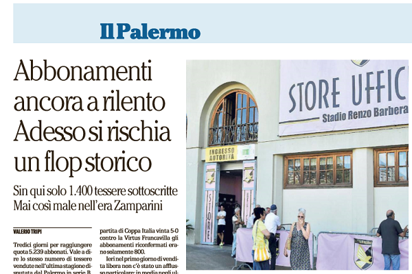 L’edizione odierna de “La Repubblica” scrive in merito al flop della campagna abbonamenti, che potrebbe essere il più grande della storia rosanero. Ecco quanto si legge: