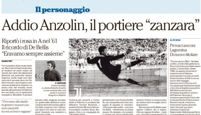 “Un trampolino di lancio per destino. Non è solo il Palermo dei tempi moderni ad avere messo nel mondo del calcio dei debuttanti diventati poi parecchio famosi. Capitava anche negli anni Sessanta ed è successo pure con Roberto Anzolin, due stagioni e settantuno presenze in rosanero. La prima cosa che Anzolin citava quando gli parlavano di Palermo era una pasta con le melanzane mangiata a Mondello. E pensare che era convinto di andare a giocare nel Milan, quando seppe che Totò Vilardo lo aveva acquistato per portarlo in rosanero. Anzolin è morto ieri a settantanove anni. Con il Palermo era retrocesso dalla A alla B nel 1959/60, ma vinse subito il campionato nella stagione successiva, quella della definitiva consacrazione che lo fece notare agli occhi della Juventus. Con i bianconeri giocò 310 volte in nove stagioni vincendo uno scudetto e una Coppa Italia. A scoprire “la zanzara”, come era soprannominato per il suo fisico, fu Vilardo che lo scovò nel settore giovanile del Marzotto Valdagno, pagando il suo cartellino 40 milioni di lire, cinque in più di quelli che offriva il Milan. Un investimento ben ripagato, se si considera che dopo due anni la Juventus per portarlo a Torino diede al Palermo il cartellino del difensore Tarcisio Burgnich, i prestiti di Carlo Mattrel e del centrocampista svedese Rune Borjesson, oltre a un conguaglio da 100 milioni di lire. «È agile come un gatto – disse di lui Cestmir Vycpalek, che lo ha allenato in rosanero, in una sorta di scheda tecnica – schizza da un palo all’altro con guizzi felini. Impeccabile nelle uscite basse, meno in mischia e in uscita alta». In città si muoveva sulla Topolino di Malavasi e fra i suoi più grandi amici c’era Tonino De Bellis, suo coinquilino oltre che compagno di squadra in rosanero. «Vivevamo allo stadio – racconta De Bellis – dividevamo la stessa stanza. Ho pensato a lui proprio in queste ore. Stavo sistemando alcuni numeri di telefono e ho pensato di chiamarlo, ma poi non l’ho fatto. Non stava bene, ci eravamo sentiti per le feste come facevamo per ogni ricorrenza. Da quando abbiamo giocato insieme siamo rimasti in contatto, anche quando poi lui è andato alla Juventus e ci siamo ritrovati avversari a Torino. La nostra amicizia andava oltre le maglie che indossavamo ». Nel racconto di De Bellis si percepisce l’affetto che li legava. «Era un ragazzo favoloso – continua – Quando ci siamo sentiti l’ultima volta non se la passava benissimo. Vivevamo insieme, andavamo al ristorante insieme, uscivamo insieme. Facevamo tutto insieme. Di solito chi para è un po’ pazzoide, lui no. Era serio e tranquillo. Sono veramente addolorato»”. Questo quanto riportato dall’edizione odierna de “La Repubblica”.
