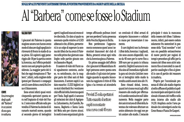 “I giocatori del Palermo in questa stagione ancora non hanno avuto modo di sbucare dagli spogliatoi e ritrovarsi di fronte lo stadio di casa pieno. Gli capiterà oggi pomeriggio alle 18 per la partita contro la Juventus, ma l’effetto probabilmente non sarà proprio quello desiderato. La maggior parte dei tifosi che oggi riempiranno il “Barbera”, infatti, nella migliore delle ipotesi per Diamanti e compagni avrà il cuore diviso a metà fra il rosa e il bianconero. Sono attesi infatti quasi venticinquemila spettatori questa sera nell’impianto di viale del Fante. L’unico dato ufficiale sulla prevendita il Palermo ha deciso di diramarlo martedì scorso, quando al secondo giorno di botteghini aperti i tagliandi staccati erano oltre diecimila. Un dato al quale va sommato quello relativo ai 6.323 abbonati e che, di fatto, permetterà in un colpo di superare la somma dei tifosi che ha avuto il Palermo nelle prime due giornate casalinghe nelle partite giocate contro Sassuolo e Napoli. Il cassiere di viale del Fante sarà ugualmente contento, anche se, va sottolineato, che la maggior parte dei tifosi sarà di fede bianconera. Il settore ospiti è andato esaurito: i 2.233 biglietti sono stati distribuiti fra i ventinove club ufficiali della Juventus sparsi per l’Isola. Sugli spalti ci saranno gli striscioni dei club di Agrigento, Caltanissetta, Aci Castello, Ramacca, Bagheria e Santa Lucia del Mela solo per citarne alcuni. In molti si sono organizzati già da tempo affittando pullman interi per non perdersi l’unica presenza della Vecchia Signora in Sicilia. Non perderanno l’appuntamento nemmeno quest’anno i sostenitori bianconeri del club di Malta, presenti ormai ogni volta che la Juventus gioca a Palermo. Un primo assaggio dell’affetto che i giocatori di Massimiliano Allegri potranno avere questa sera allo stadio c’è già stato ieri pomeriggio quando la squadra bianconera ha raggiunto il ritiro di Villa Igiea e ha trovato ad attenderla un centinaio di tifosi armati di sciarpette bianconere e cellulari in mano per immortalare il momento. Il caro biglietti non ha fermato i tifosi della Juventus: i tagliandi, che sono ancora disponibili, vanno da 40 euro per le curve fino a 300 euro per un posto in tribuna autorità. I biglietti saranno in vendita sino all’immediata vigilia della gara sul circuito Listicket mentre ai botteghini dello stadio la vendita andrà avanti sino alle 14. Sono rimasti delusi, invece, quanti ieri si sono recati agli uffici rosanero allo stadio per effettuare il cambio nominativo sull’abbonamento. Nella maggior parte dei casi si trattava di tifosi della Juventus che volevano sfruttare un amico abbonato che oggi non potrà andare allo stadio. L’ostacolo principale è stata la mancanza della tessera del tifoso: l’abbonamento, infatti, può essere ceduto solamente fra sostenitori in possesso della “Goal member” e ieri non era possibile sottoscriverne di nuove perché per ragioni di tempi e procedura gli uffici per la tessera del tifoso sono attivi solamente fino al mercoledì in caso di partite casalinghe o fino al giovedì in caso di partite dei rosanero in trasferta. Proprio per l’eccezionale presenza di tifosi allo stadio rispetto al solito afflusso di pubblico la polizia municipale anticiperà la tradizionale chiusura del traffico nella zona intorno allo stadio alle 14,30. Ampliata anche l’area pedonale che coinvolgerà anche via Croce Rossa e Piazza De Gasperi”. Questo quanto si legge sull’edizione odierna de “La Repubblica”.