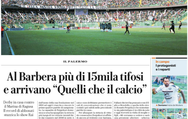 L’edizione odierna de “La Repubblica” ha analizzato quella che sarà la sfida di oggi tra Palermo e Marina di Ragusa. Sfida che sarà seguita al “Barbera” da più di 15 mila spettatori oggi per il primo derby casalingo della stagione che vedrà il Palermo alle 15 ospitare il Marina di Ragusa. E anche oggi si rinnoverà il clima di festa che sta accompagnando le partite casalinghe dei rosanero. Oggi attesa una novità per la serie D, a sbirciare in casa Palermo ci saranno anche le telecamere di Quelli che il calcio che sono state attirate dal record di abbonamenti del campionato centrato dai tifosi palermitani con 10.446 tesseramenti sottoscritti. Il quotidiano inoltre, analizza quelle che saranno le scelte di Pergolizzi per allungare la striscia di vittorie consecutive. Il tecnico si affiderà ancora al tridente con Santana, Felici e Ricciardo in campo dal primo minuto. A centrocampo l’unico ballottaggio è fra Langella e Kraja sulla mezzala sinistra, mentre Martin in cabina di regia e Martinelli sulla destra sono certi di una maglia da titolare. In difesa, davanti al portiere Pelagotti, Crivello e Lancini sembrano avere conquistato le prime posizioni nelle gerarchie dei difensori centrali, mentre per le maglie dei due terzini i favoriti sono Doda e Vaccaro.