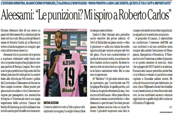 “Haitam Aleesami dice di non avere un punto di riferimento fra i calciatori più famosi nel suo ruolo. Ma quando gli fanno il nome di Roberto Carlos gli si illumina il volto e si lascia scappare un «magari, speriamo di fare bene come lui». Aleesami tira le punizioni ed è pronto a macinare chilometri sulla fascia sinistra. In questa stagione ha già giocato cinque partite di Europa League. Non tutte e sei le gare preliminari disputate dal Goteborg solo perché nella prima ha contribuito alla vittoria per 5-0 contro i gallesi del Llandudno e l’allenatore al ritorno ha fatto ampio turnover. «Sono pronto per giocare sin da subito — dice l’esterno norvegese per passaporto, ma marocchino d’origine — Palermo per me è una tappa importante della carriera. Passare dal freddo di Goteborg al caldo siciliano è stato bello anche perché nelle mie vene scorre sangue marocchino». Contro il Bari domani sera potrebbe anche esordire dal primo minuto. «Il 3-4-3 di Ballardini mi piace molto — dice il giocatore — sulla mia fascia ho molte opportunità per restare sempre nel vivo del gioco. Fra le mie caratteristiche c’è quella di attaccare molto, ma so bene che devo badare anche a coprire. So bene insomma che mi tocca fare su e giù per tutta la fascia tantissime volte. Ma la cosa non mi spaventa». Al “Barbera” c’è già stato sabato sera, da spettatore, per l’amichevole con l’Olympique Marsiglia. In quella partita, sulla fascia che presto diventerà la sua, c’era ancora Achraf Lazaar. «Non posso dire se abbiamo le stesse caratteristiche — dice Aleesami — perché non l’ho visto giocare spesso. Sabato sera ho visto un buon Palermo. I giocatori sapevano cosa fare in campo e mi sembravano ben organizzati. La squadra mi è sembrata compatta». A proposito di Lazaar, il marocchino ha confermato l’interesse dell’OM nei suoi confronti e sul suo cartellino resta sempre alta anche l’attenzione di Olympiacos, Sampdoria e Fiorentina. Il Palermo ha tutto l’interesse a cedere il giocatore in questa sessione di mercato, visto che a giugno del 2017 andrà in scadenza. Domani sera Lazaar potrebbe anche finire in tribuna o restare in panchina come capitato a Gonzalez sabato scorso. Rischia di rimanere fuori per infortunio, invece, Oscar Hiljemark che ieri ha rimediato un risentimento al retto femorale sinistro. Le sue condizioni saranno valutate oggi insieme a quelle degli altri acciaccati Embalo e Trajkovski”. Questo quanto si legge su “La Repubblica”.