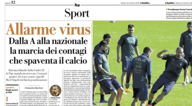 Repubblica: “Allarme virus. Dalla A alla nazionale la marcia dei contagi che spaventa il calcio”