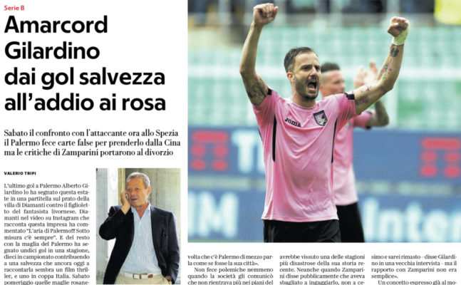 “L’ultimo gol a Palermo Alberto Gilardino lo ha segnato questa estate in una partitella sul prato della villa di Diamanti contro il figlioletto del fantasista livornese. Diamanti nel video su Instagram che racconta questa impresa ha commentato “L’aria di Palermo!!! Sotto misura c’è sempre”. E del resto con la maglia del Palermo ha segnato undici gol in una stagione, dieci in campionato contribuendo a una salvezza che ancora oggi a raccontarla sembra un film thriller, e uno in coppa Italia. Sabato pomeriggio quelle maglie rosanero che prima di indossarle lo affascinavano tanto e che poi a leggere i suoi racconti gli sono entrate nel cuore, se le ritroverà contro. Lui, con lo Spezia, cercherà di fare quello che gli riesce meglio, il Palermo proverà a impedirglielo.
