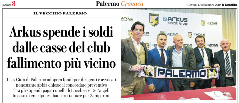 “Gli amministratori del vecchio Palermo stanno spendendo i pochi soldi rimasti nelle casse della società per pagare avvocati e commercialisti incaricati di predisporre il piano per evitare il fallimento e accedere al concordato preventivo. Una mossa che la procura ha subito contestato al collegio fallimentare: per il sostituto procuratore Andrea Fusco, dopo la richiesta di preventivo non è possibile fare alcuna operazione contabile prima del pronunciamento del giudice, pena l’esclusione dal concordato. Su questo punto il collegio si pronuncerà nella prossima udienza fissata per il 2 ottobre ed è fondato il rischio che non venga accettata la richiesta di concordato, aprendo di fatto le porte al fallimento. L’utilizzo del denaro arrivato da transazoni per vendite di calciatori all’estero ha scatenato anche l’ira degli ex giocatori dell’Us Città di Palermo nei confronti dei proprietari del gruppo Arkus: tutti gli ex tesserati, che devono ancora ricevere gli ultimi tre stipendi relativi alla scorsa stagione, ieri hanno chiesto al giudice in sede cautelare di congelare i conti correnti della società e di bloccare i crediti che la Lega di serie B ( per altro già pignorati) deve ancora versare al vecchio club rosanero. Si tratta complessivamente di cinque milioni di euro, un credito che l’Us Città di Palermo vanta con la Lega di serie B come bilancio fra le cessioni e gli acquisti di giocatori. A destare preoccupazione è soprattutto l’operazione da 370 mila euro che Salvatore Tuttolomondo ha effettuato per pagare uno studio di professionisti che allestisse il piano del concordato da presentare ai giudici. Uno studio che in parte è di sua proprietà. Oltre ai consulenti la vecchia proprietà ha provveduto a pagare lo stipendio di agosto alla ventina di dipendenti rimasti nell’Us Città di Palermo, che però avanzano ancora le mensilità di maggio, giugno e luglio. Fra gli stipendi pagati ci sono anche quelli dei dirigenti amministrativi, fra cui quelli di Daniela De Angeli e Fabrizio Lucchesi”.