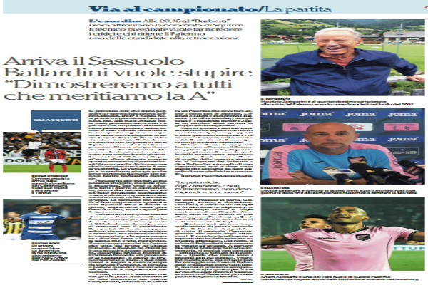 “Si potrebbe dire che inizio peggiore il Palermo non poteva avere: Sassuolo, Inter e Napoli nelle prime tre giornate di campionato. Ma, allo stato attuale delle cose, probabilmente non c’è partita che in questo momento i rosa possono pensare abbordabile. E così Davide Ballardini e la sua squadra si gettano a capofitto nella nuova stagione di serie A con la forza di chi vuol far ricredere tutti quelli che danno il Palermo con un piede in serie B prima ancora che inizi il campionato. «Dicono che partiamo da ultimi – dice Ballardini – Ma non credo che sia così e soprattutto non credo che sia giusto». La mission del Palermo di quest’anno allora diventa proprio questa: sovvertire il pronostico. «Abbiamo voglia di dimostrare che il campionato di serie A non ci va stretto. Lo vogliamo giocare e lo vogliamo giocare anche bene partendo da quelle che sono le nostre peculiarità migliori». Peculiarità che magari ai più possono sfuggire, ma sulle quali Ballardini, che vede la squadra tutti i giorni in allenamento, punta con decisioni. «Ci sono delle premesse buonissime – dice il tecnico – Quando ci alleniamo ci divertiamo. Facciamo gruppo. Lo facciamo con serietà e coinvolgimento. Questa è una squadra seria e anche la gente, soprattutto nella gara contro il Bari, lo ha capito perfettamente». Un concetto sul quale Ballardini torna di continuo nella conferenza stampa pre partita. Lo fa anche con mestiere quando dribbla la domanda sui presunti contrasti con il presidente Zamparini. Si lascia scappare solo un «io non devo rispondere a nessuno», ma poi torna subito in carreggiata. «Io sono contento – dice con forza – La squadra si allena che è una meraviglia. Siamo un gruppo che ha fame e che lotta dal primo all’ultimo minuto». E quando gli chiedi se è una squadra ancora incompleta, Ballardini dribbla meglio di Cristiano Ronaldo. «Io penso solo al Sassuolo». E anche di Bruno Henrique e Buoy, i due colpi messi a segno a centrocampo da Daniele Faggiano, si tornerà a parlare quando i due saranno veramente a disposizione del tecnico. E così, contro il Sassuolo che nel giro di pochi anni è diventato una corazzata del nostro campionato, Ballardini schiererà un Palermo che deve fare anche i conti con le assenze. L’elenco è lungo e comprende Rajkovic (in forte dubbio), Morganella e Trajkovski mentre Jajalo ed Embalo sono tornati in gruppo soltanto giovedì. «Ma in questo Palermo quello che conta è sapere che non ci sono i titolari, ma un gruppo di trenta giocatori compresi i Primavera che tutti molto coesi e uniti. Gente che si allena e gioca con grande entusiasmo». Chissà se l’entusiasmo potrà bastare per affrontare il Sassuolo e, più in generale, disputare un campionato diverso da quello dello scorso anno, soprattutto con un finale meno sofferto di quello della passata stagione. «L’obiettivo del Palermo – dice Ballardini – è quello di non risparmiarsi mai e dare tutto quello che abbiamo da dare a livello di energie fisiche e mentali». Il primo Palermo della stagione vedrà Posavec in porta, Goldaniga, Vitiello e Andelkovic centrali ( a meno di un recupero in extremis di Rajkovic). A centrocampo Gazzi e Hiljemark centrali con Rispoli e Aleesami esterni. In avanti in trio d’attacco con Bentivegna, Quaison ed Embalo che sono favoriti su Nestorovski e Balogh. «Quaison può giocare tranquillamente da punta centrale – dice Ballardini – Lui può fare di tutto. Il centrale, l’esterno, giocare alle spalle degli attaccanti. È rapido e intelligente e soprattutto ha delle spiccate attitudini offensive». Del resto, il calcio di Ballardini è sempre stato votato all’attacco. A portare più gente possibile nell’area avversaria. «I moduli non contano – sottolinea il tecnico di Ravenna – Quello che conta sono i principi con cui giochi». Vedremo questa sera, ma intanto può far coraggio una frase di Ballardini: «Possiamo avere tanti limiti, ma noi ci proviamo sempre». Sembra lo spot giusto per il Palermo che oggi contro il Sassuolo inizia una delle sua più complicate stagioni di serie A”. Questo quanto si legge sull’edizione odierna de “La Repubblica”.