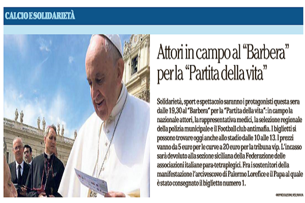 “Solidarietà, sport e spettacolo saranno i protagonisti questa sera dalle 19,30 al “Barbera” per la “Partita della vita”: in campo la nazionale attori, la rappresentativa medici, la selezione regionale della polizia municipale e il Football club antimafia. I biglietti si possono trovare oggi anche allo stadio dalle 10 alle 13. I prezzi vanno da 5 euro per le curve a 20 euro per la tribuna vip. L’incasso sarà devoluto alla sezione siciliana della Federazione delle associazioni italiane para-tetraplegici. Fra i sostenitori della manifestazione l’arcivescovo di Palermo Lorefice e il Papa al quale è stato consegnato il biglietto numero 1”. Questo quanto si legge su “La Repubblica”.