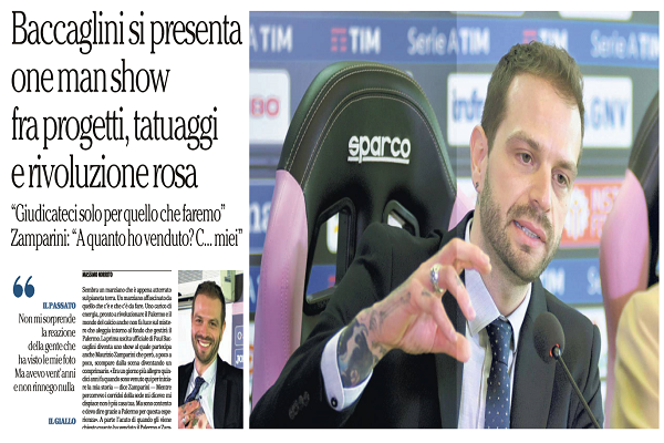 “Sembra un marziano che è appena atterrato sul pianeta terra. Un marziano affascinato da quello che c’è e che c’è da fare. Uno carico di energia, pronto a rivoluzionare il Palermo e il mondo del calcio anche non fa luce sul mistero che aleggia intorno al fondo che gestirà il Palermo. La prima uscita ufficiale di Paul Baccaglini diventa uno show al quale partecipa anche Maurizio Zamparini che però, a poco a poco, scompare dalla scena diventando un comprimario. «Era un giorno più allegro quindici anni fa quando sono venuto qui per iniziare la mia storia — dice Zamparini — Mentre percorrevo i corridoi della sede mi dicevo: mi dispiace non è più casa tua. Ma sono contento e devo dire grazie a Palermo per questa esperienza». A parte l’acuto di quando gli viene chiesto quanto ha venduto il Palermo e Zamparini risponde: «Cazzi miei», per il resto l’ex presidente resta ad ascoltare e la conferenza stampa diventa l’One man show di Paul Baccaglini.