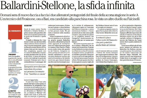 “Eccoli di nuovo contro. Davide Ballardini e Roberto Stellone, il primo ancora sulla panchina del Palermo e il secondo passato dalla guida del Frosinone a quella del Bari. Il duello a distanza fra i due tecnici è stato uno dei temi della volata salvezza che ha caratterizzato lo scorso campionato, almeno fino allo scontro diretto di Frosinone vinto poi dai rosanero. A fine campionato, quando non era certo che Ballardini rimanesse sulla panchina del club di viale del Fante, il nome di Stellone era fra i più caldi per la guida dei rosanero. E domani sera i due si contenderanno il passaggio del turno in Coppa Italia. Il caso li ha messi l’uno sulla strada dell’altro molto spesso ultimamente. In campionato l’anno scorso sia all’andata che al ritorno ha avuto la meglio Ballardini. All’andata al “Barbera” finì 4-1, al ritorno al “Matusa” 0-2. Quelle sono state le prime due volte da avversari in panchina, prima ancora c’era stato un solo precedente fra Ballardini allenatore del Cagliari e Stellone attaccante del Torino: era il campionato 2007/2008 e anche in quella circostanza vinse Ballardini per 3-0. I due allenatori si sono tirati fuori a maggio dalle polemiche sulla lotta per non retrocedere che invece ha visto protagoniste le rispettive società. Quando prima Zamparini ha accusato il Verona di avere regalato la partita al Frosinone e poi i ciociari hanno risposto minacciando querela nei confronti del Palermo e del suo presidente. Anzi a sfida risolta in suo favore, Ballardini ha fatto i complimenti per il clima di massima sportività che si è vissuto nello scontro diretto di Frosinone e Stellone ha elogiato il lavoro del suo collega. L’unico momento di polemica sollevata dall’attuale allenatore del Bari è stato quando si è trattato l’argomento del famoso paracadute per le retrocesse. «Il sistema non è giusto — disse Stellone — si creano situazioni che possono fare pensare male». Ma poi tutto è rientrato nella massima sportività. A fine campionato la sfida fra i due si è spostata su un altro piano: proprio quando Ballardini era pronto a dimettersi prima di avere appianato le incomprensioni con l’allora direttore sportivo rosanero Rino Foschi e Stellone era molto vicino alla panchina del Palermo. Zamparini ne aveva parlato nel corso di un’intervista radiofonica e quel suo «mi piace Stellone» suonava già come un’investitura. Ad alimentare le voci, poi, è stato il classico mai dire mai che da sempre muove le notizie di calciomercato. «Bisognerà capire se l’interesse del Palermo è concreto — aveva commentato Stellone — Essere accostati ad un club come quello rosanero, non può che fare piacere. Un problema lavorare con Zamparini? Assolutamente no, amo le sfide per cui nessun problema». Ma anche in questo caso la sfida è andata a Ballardini che ha conservato la panchina. E pensare che Stellone era stato accostato al Palermo anche all’inizio della stagione scorsa, quando Iachini chiedeva garanzie e Zamparini non era sicuro di volergliele dare. Poi tutti sanno come è andata a finire. Ed è per questo che è facile immaginare quanta voglia abbia Stellone domani sera di avere la meglio sui rosanero. E a questo proposito entra in gioco il terzo piano della sfida fra i due tecnici. Ballardini cerca ancora di ottenere dalla sua società i rinforzi che ritiene necessari per raggiungere la salvezza. Stellone sta amalgamando i giocatori che la nuova società del Bari guidata da Cosmo Giancaspro, con il diesse Sean Sogliano, ex rosa, gli sta mettendo a disposizione fra cui Mattia Cassani, anche lui un ex del Palermo. Per il Bari quello di domani sarà il secondo impegno ufficiale dopo avere eliminato il Cosenza al San Nicola domenica scorsa con gol di Monachello, siciliano di Agrigento, cercato dal Palermo sia l’anno scorso che in questa sessione di mercato. E una nuova sfida è già all’orizzonte, sempre sul mercato: sia Ballardini che Stellone cercano una prima punta. Entrambi hanno nel mirino l’attaccante del Sassuolo Diego Falcinelli. Ma questa volta fra i due litiganti potrebbe finire in pareggio e a godere potrebbe essere il Crotone”. Questo quanto si legge sull’edizione odierna de “La Repubblica”.