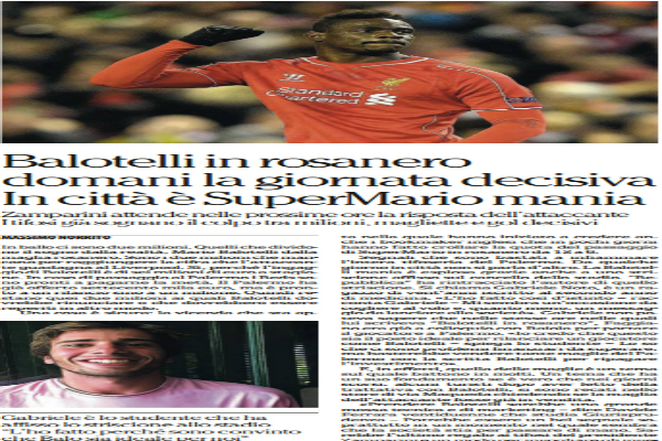 “In ballo ci sono due milioni. Quelli che dividono il sogno dalla realtà, Mario Balotelli dalla maglia rosanero. Sono i due milioni che mancano per raggiungere la cifra che l’attaccante guadagna al Liverpool. Sì, perché l’ingaggio di Balotelli è di sei milioni di euro a stagione. In caso di passaggio al Palermo i Reds sono pronti a pagarne la metà. Il Palermo ha già offerto settecento mila euro, ma è pronto a un rilancio sino a un milione. Quindi restano quei due milioni ai quali Balotelli dovrebbe rinunciare o che dovrebbero essere reperiti in altro modo. Una cosa è sicura: la vicenda che sta appassionando i tifosi del Palermo è vicina al suo epilogo. È stato proprio Balotelli, in uno dei due colloqui telefonici avuti nelle ultime ore con Maurizio Zamparini, ha chiedere un po’ di tempo. Il week end prima di decidere se accettare la corte dei rosanero. SuperMario non ha smesso di sognare la Premier League e in Inghilterra ha molti estimatori. Dall’altra parte c’è però Mino Raiola, il suo agente, che spinge perché Balotelli accetti il Palermo considerando quella rosanero la piazza ideale per il rilancio del giocatore. Una teoria che è quella sulla quale ha puntato tutto Zamparini insieme al direttore sportivo Faggiano che, anche grazie all’aiuto di Diamante, sono da giorni in pressing su Balotelli e sul suo procuratore. Una scelta di cuore, legata anche al fatto che Balotelli è nato a Palermo e proprio a Palermo da piccolissimo è stato operato per una serie di problemi allo stomaco. Una scelta nella quale hanno iniziato a credere anche i bookmaker inglesi che in pochi giorni hanno fatto crollare la quota del passaggio di SuperMario in rosanero da 12 a 6. Segnali che sono bastati a infiammare l’intera tifoseria del Palermo. Da qualche giorno in città non si parla d’altro. La Balotelli mania è esplosa grazie anche a uno striscione affisso sul cancello dello stadio. “Repubblica” ha rintracciato l’autore di quello striscione. Si chiama Gabriele Noto, è un ragazzo di vent’anni iscritto al secondo anno di medicina. «L’ho fatto così d’istinto – racconta Gabriele – Mi sembra un’occasione da cogliere al volo e, quanto meno, un messaggio da lanciare alla società». Gabriele non poteva sapere che nelle stesse ore nelle quali lui scriveva “Balotelli in rosanero”, Faggiano era già a colloquio con Raiola per portare il giocatore a Palermo. «Io credo che questo sia il posto ideale per rilanciare un giocatore come Balotelli – spiega lo studente – Lo so che ci sono problemi finanziari da superare, ma basterebbe vendere tante maglie del Palermo con la scritta Balotelli per ripagare l’investimento». E, in effetti, quella delle maglie è un tema sul quale battono in molti. Un tema che ha un suo fondamento se è vero che nei giorni scorsi, alcuni turisti dopo aver letto della trattativa con Balotelli, si sono recati nello store di via Maqueda chiedendo se la maglia dell’attaccante fosse già in vendita. «Prendere Balotelli sarebbe una grande mossa tecnica e di marketing – dice Davide Ferrara ventiduenne che studia Giurisprudenza – Potrebbe essere un bel segnale soprattutto in un momento nel quale sembra che la società stia per passare di mano. Sarebbe l’ultimo regalo ai tifosi del presidente Zamparini e un modo per invogliare gli investitori». Insomma, anche Mario Balotelli entrerebbe con forza nelle vicende legate alla cessione della società. «Sarebbe un grande colpo d’immagine soprattutto per i cinesi – dice Andrea Russo, ventuno anni, anche lui studente di Giurisprudenza – Balotelli non potrebbe che trarre benefici da un suo passaggio in rosanero. Palermo sarebbe la piazza giusta nella quale tornare ai livelli di un tempo. Sono convinto che il suo ingaggio, oltre a fare bene alla squadra, riporterebbe entusiasmo e lo stadio tornerebbe a riempirsi». Ma c’è anche chi avanza dei dubbi sull’impatto di Balotelli nello spogliatoio. «Mario è un fenomeno e mi è sempre piaciuto – dice Andrea Naselli, ventuno anni, appena laureatosi a Londra in Business Administration – Non sono però convinto che filerebbe tutto liscio. Balotelli in rosanero sarebbe però un grande affare tecnico e commerciale. Basti pensare quante maglie si venderebbero».”. Questo quanto si legge sull’edizione odierna de “La Repubblica”.