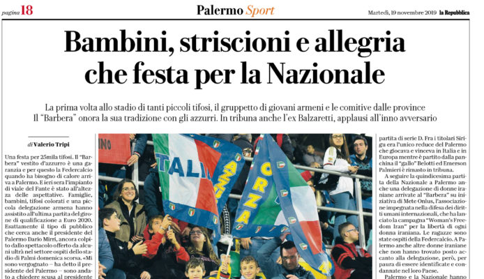 L’edizione odierna de “La Repubblica” racconta della festa che ha visto ieri circa 28mila tifosi accogliere l’Italia. Il “ Barbera” vestito d’azzurro è una garanzia e per questo la Federcalcio quando ha bisogno di calore arriva a Palermo. E ieri sera l’impianto di viale del Fante è stato all’altezza delle aspettative. Famiglie, bambini, tifosi colorati e una piccola delegazione armena hanno assistito all’ultima partita del girone di qualificazione a Euro 2020. Esattamente il tipo di pubblico che cerca anche il presidente del Palermo Dario Mirri, ancora colpito dallo spettacolo offerto da alcuni ultrà nel settore ospiti dello stadio di Palmi domenica scorsa. «Mi sono vergognato — ha detto il presidente del Palermo — sono andato a chiedere scusa al presidente del Palmi Rocco Simone per il comportamento di quelli che per me non sono tifosi del Palermo». Ieri Palermo, invece, ha risposto alla grande alla chiamata degli azzurri.