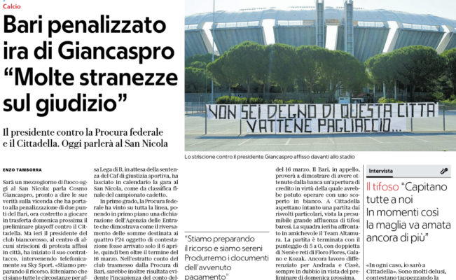 Repubblica Bari: “Ira di Giancaspro «Molte stranezze sul giudizio». Il presidente contro la Procura Federale e il Cittadella”