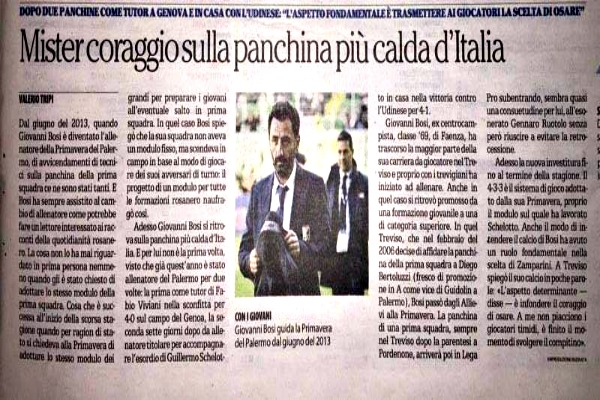“Dopo due panchina come tutor a Genoa e in casa con l’Udinese: «L’aspetto fondamentale è trasmettere ai giocatori la scelta di osare»”. Questa la grinta di Giovanni Bosi, definito quest’oggi dall’edizione odierna de “La Repubblica” Mister coraggio, per aver accettato di mettersi alla guida, affiancato da Tedesco, della panchina più calda d’Italia.