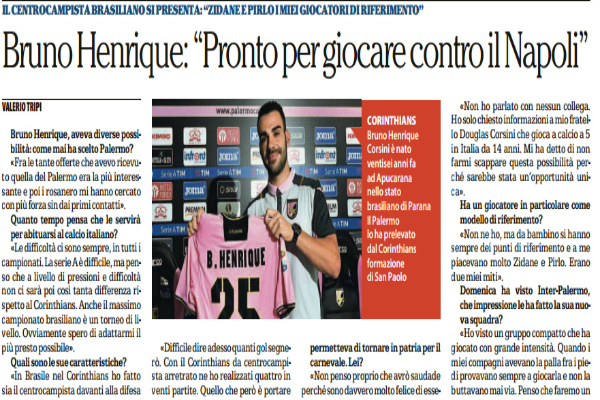 “Bruno Henrique, aveva diverse possibilità: come mai ha scelto Palermo? «Fra le tante offerte che avevo ricevuto quella del Palermo era la più interessante e poi i rosanero mi hanno cercato con più forza sin dai primi contatti». Quanto tempo pensa che le servirà per abituarsi al calcio italiano? «Le difficoltà ci sono sempre, in tutti i campionati. La serie A è difficile, ma penso che a livello di pressioni e difficoltà non ci sarà poi così tanta differenza rispetto al Corinthians. Anche il massimo campionato brasiliano è un torneo di livello. Ovviamente spero di adattarmi il più presto possibile». Quali sono le sue caratteristiche? «In Brasile nel Corinthians ho fatto sia il centrocampista davanti alla difesa con compiti di copertura, ma anche il regista in un centrocampo a due, con due fonti di gioco. Ora vedremo quale posizione potrà essere la migliore per me e per il Palermo. Per me non fa differenza». Si è posto un obiettivo in termini di gol? «Difficile dire adesso quanti gol segnerò. Con il Corinthians da centrocampista arretrato ne ho realizzati quattro in venti partite. Quello che però è portare con onore la maglia del Palermo e devo ringraziare il presidente Zamparini e tutti i dirigenti che si sono occupati della trattativa per avermi dato l’opportunità di arrivare in Sicilia». Per i brasiliani che giocano in Italia si parla spesso di saudade. Edmundo addirittura aveva una clausola che gli permetteva di tornare in patria per il carnevale. Lei? «Non penso proprio che avrò saudade perché sono davvero molto felice di essere a Palermo. Penso solo di adattarmi rapidamente al calcio italiano ed europeo. L’Italia poi è un paese bellissimo che accoglie bene. Sono davvero troppo felice per pensare di avere saudade». Ha chiesto consiglio a qualche suo connazionale prima di accettare Palermo? «Non ho parlato con nessun collega. Ho solo chiesto informazioni a mio fratello Douglas Corsini che gioca a calcio a 5 in Italia da 14 anni. Mi ha detto di non farmi scappare questa possibilità perché sarebbe stata un’opportunità unica». Ha un giocatore in particolare come modello di riferimento? «Non ne ho, ma da bambino si hanno sempre dei punti di riferimento e a me piacevano molto Zidane e Pirlo. Erano due miei miti». Domenica ha visto Inter-Palermo, che impressione le ha fatto la sua nuova squadra? «Ho visto un gruppo compatto che ha giocato con grande intensità. Quando i miei compagni avevano la palla fra i piedi provavano sempre a giocarla e non la buttavano mai via. Penso che faremo un buon campionato». Pronto per giocare contro il Napoli? «In Brasile siamo a metà stagione e fino ad ora ho giocato titolare. Qui siamo appena all’inizio del campionato. Sono in forma e a disposizione dell’allenatore. Tocca a lui fare le scelte»”. Questo ciò che si legge sull’edizione odierna de “La Repubblica”