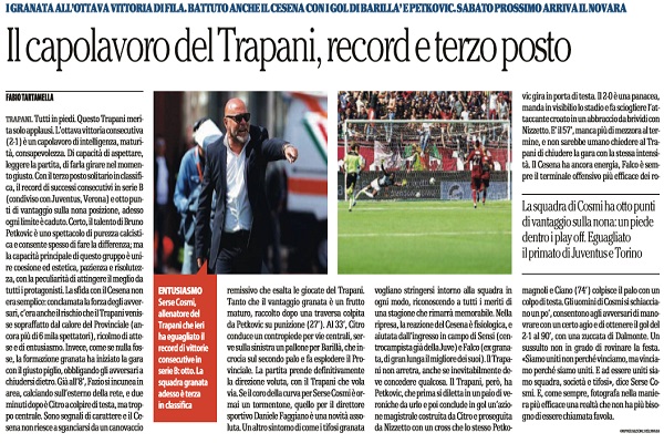 “Tutti in piedi. Questo Trapani merita solo applausi. L’ottava vittoria consecutiva (2-1) è un capolavoro di intelligenza, maturità, consapevolezza. Di capacità di aspettare, leggere la partita, di farla girare nel momento giusto. Con il terzo posto solitario in classifica, il record di successi consecutivi in serie B (condiviso con Juventus, Verona) e otto punti di vantaggio sulla nona posizione, adesso ogni limite è caduto. Certo, il talento di Bruno Petkovic è uno spettacolo di purezza calcistica e consente spesso di fare la differenza; ma la capacità principale di questo gruppo è unire coesione ed estetica, pazienza e risolutezza, con la peculiarità di attingere il meglio da tutti i protagonisti. La sfida con il Cesena non era semplice: conclamata la forza degli avversari, c’era anche il rischio che il Trapani venisse sopraffatto dal calore del Provinciale (ancora più di 6 mila spettatori), ricolmo di attese e di entusiasmo. Invece, come se nulla fosse, la formazione granata ha iniziato la gara con il giusto piglio, obbligando gli avversari a chiudersi dietro. Già all’8’, Fazio si incunea in area, calciando sull’esterno della rete, e due minuti dopo è Citro a colpire di testa, ma troppo centrale. Sono segnali di carattere e il Cesena non riesce a sganciarsi da un canovaccio remissivo che esalta le giocate del Trapani. Tanto che il vantaggio granata è un frutto maturo, raccolto dopo una traversa colpita da Petkovic su punizione (27’). Al 33’, Citro conduce un contropiede per vie centrali, serve sulla sinistra un pallone per Barillà, che incrocia sul secondo palo e fa esplodere il Provinciale. La partita prende definitivamente la direzione voluta, con il Trapani che vola via. Se il coro della curva per Serse Cosmi è ormai un tormentone, quello per il direttore sportivo Daniele Faggiano è una novità assoluta. Un altro sintomo di come i tifosi granata vogliano stringersi intorno alla squadra in ogni modo, riconoscendo a tutti i meriti di una stagione che rimarrà memorabile. Nella ripresa, la reazione del Cesena è fisiologica, e aiutata dall’ingresso in campo di Sensi (centrocampista già della Juve) e Falco (ex granata, di gran lunga il migliore dei suoi). Il Trapani non arretra, anche se inevitabilmente deve concedere qualcosa. Il Trapani, però, ha Petkovic, che prima si diletta in un paio di veroniche da urlo e poi conclude in gol un’azione magistrale costruita da Citro e proseguita da Nizzetto con un cross che lo stesso Petkovic gira in porta di testa. Il 2-0 è una panacea, manda in visibilio lo stadio e fa sciogliere l’attaccante croato in un abbraccio da brividi con Nizzetto. E’ il 57’, manca più di mezzora al termine, e non sarebbe umano chiedere al Trapani di chiudere la gara con la stessa intensità. Il Cesena ha ancora energia, Falco è sempre il terminale offensivo più efficace dei romagnoli e Ciano (74’) colpisce il palo con un colpo di testa. Gli uomini di Cosmi si schiacciano un po’, consentono agli avversari di manovrare con un certo agio e di ottenere il gol del 2-1 al 90’, con una zuccata di Dalmonte. Un sussulto non in grado di rovinare la festa. «Siamo uniti non perché vinciamo, ma vinciamo perché siamo uniti. E ad essere uniti siamo squadra, società e tifosi», dice Serse Cosmi. E, come sempre, fotografa nella maniera più efficace una realtà che non ha più bisogno di essere chiamata favola”. Questo quanto scrive l’edizione odierna de “La Repubblica” in merito al momento d’oro del Trapani.