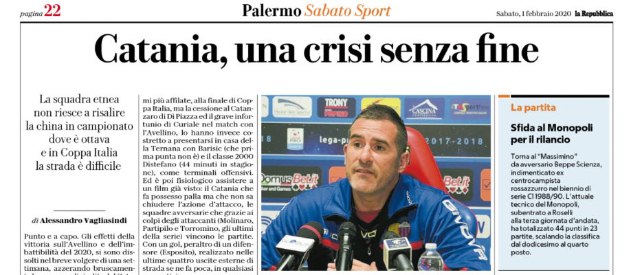 L’edizione odierna di “Repubblica” parla della situazione in casa Catania. Gli effetti della vittoria sull’Avellino e dell’imbattibilità del 2020, si sono dissolti nel breve volgere di una settimana, azzerando bruscamente le speranze di risalita del Catania. Dal 3- 1 interno sui campani di mercoledì 22, con Lucarelli esultante a fine partita, al doppio k.o., in tre giorni, tra Viterbo e Terni, culminato con un silenzio stampa di cui non si conoscono le motivazioni, i rossazzurri si ritrovano a capo chino – scrive il quotidiano -. E la tensione nel post partita della semifinale di Coppa Italia lo rivela. Non solo la rabbia per la sconfitta, ma verosimilmente dietro il silenzio di un rabbuiato Lucarelli, si cela il malcontento sulle strategie di mercato per il potenziamento del reparto d’attacco. L’allenatore livornese auspicava da tempo l’arrivo di un nuovo attaccante per puntare, con armi più affilate, alla finale di Coppa Italia, ma la cessione al Catanzaro di Di Piazza ed il grave infortunio di Curiale nel match con l’Avellino, lo hanno invece costretto a presentarsi in casa della Ternana con Barisic ( che prima punta non è) e il classe 2000 Distefano ( 44 minuti in stagione), come terminali offensivi. Si sperava nell’apporto dei nuovi acquisti di gennaio, ma il pregresso minutaggio stagionale pregresso non poteva legittimare, nell’immediato, grandi aspettative: 0 minuti per Curcio nel Vicenza e per Vicente nella Juve Stabia, 206 minuti (l’ultima da titolare a Settembre) per Salandria nella Reggina, 562 minuti ( mai titolare) per Manneh nella Carrarese. Se è pur vero che da Camplone a Lucarelli la media punti a partita, tra campionato e Coppa Italia, si è innalzata da 1,50 ad 1,97, il fardello di 10 sconfitte stagionali (già quasi lo stesso numero, 11, di quelle incassate nell’intera stagione 2018/ 19), orienta in negativo le prospettive future. Alla vigilia del match interno col Monopoli ( calcio d’inizio domani alle ore 15, visibile sulla piattaforma Eleven Sports), la stretta attualità fotografa un rendimento modesto: ottavo posto in campionato, con un risicato margine di 3 punti sull’undicesima posizione, che significherebbe esclusione dai play- off, ed uno 0- 2 da rimontare nella semifinale di ritorno di Coppa Italia (in programma il 13 Febbraio al Massimino), contro un’avversaria, la Ternana, che quest’anno mai ha perso con tre gol di scarto.