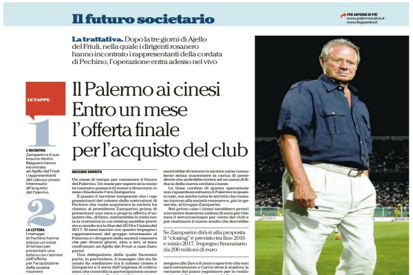 “Un mese di tempo per conoscere il futuro del Palermo. Un mese per sapere se la società rosanero passerà di mano e diventerà cinese chiudendo l’era Zamparini. È questo il termine temporale che i rappresentanti del colosso delle costruzioni di Pechino che vuole acquistare la società ha chiesto al presidente Zamparini prima di presentare una vera e propria offerta d’acquisto che, di fatto, metterebbe in moto tutta la trattativa in cui closing sarebbe previsto a cavallo tra la fine del 2016 e l’inizio del 2017. Si sono lasciati con questo impegno i rappresentanti del gruppo interessato al Palermo e i dirigenti della società rosanero che per diversi giorni, sino a ieri, si sono confrontati ad Ajello del Friuli a casa Zamparini. Una delegazione della quale facevano parte, in particolare, il manager che sta facendo da mediatore tra il colosso cinese e Zamparini e il socio dell’impresa di costruzioni che controlla la partecipazione economica del gruppo. Tre giorni di incontri, con una parentesi distensiva domenica pomeriggio quando il gruppo ha visto in televisione la partita tra i rosanero e la Sampdoria, nel corso dei quali sono state gettate le basi per la chiusura dell’operazione. Una trattativa che è ormai entrata nella fase avanzata visto che, al contrario di quanto era stato preventivato in un primo momento, non ci sarà una nuova visita in Italia dei rappresentanti cinesi. In pratica, dopo i contatti di questi giorni, si passerà alla seconda fase con la presentazione dell’offerta scritta. Successivamente Zamparini deciderà se accettare questa proposta o meno. Nel primo caso si passerebbe quindi alla fase conclusiva che porterebbe al passaggio del testimone in viale del Fante. Un testimone che passerebbe in mani cinesi con la costituzione di un nuovo consiglio di amministrazione all’interno del quale resterebbe comunque Zamparini che manterrebbe una quota di minoranza del venticinque per cento che gli consentirebbe di restare in società come consulente senza mantenere la carica di presidente che andrebbe invece ad un uomo di fiducia della nuova cordata cinese. Le linee cardine di questa operazione non riguardano soltanto il Palermo in quanto tale, ma anche tutte le attività che ruotano intorno alla società rosanero e, più in generale, al Gruppo Zamparini. Nel primo caso i cinesi sarebbero pronti a investire duecento milioni di euro per rilevare il settantacinque per cento del club e per realizzare il nuovo stadio che dovrebbe sorgere allo Zen e il centro sportivo che non sarà certamente a Carini dove è scaduta la variante del piano regolatore per la realizzazione dell’opera in contrada Zucco e potrebbe invece nascere a Boccadifalco dove verrebbe ampliato il “Tenente Onorato” che verrebbe ceduto ai rosa dalle autorità militari con una convenzione novantennale. Cosa diversa sono gli affari che potrebbero nascere tra i cinesi, che operano soprattutto nel settore delle costruzioni, e il Gruppo Zamparini che opera nel settore dell’agricoltura biologica, delle energie rinnovabili e del turismo. Tutti campi nei quali il Palermo non entrerebbe direttamente o entrerebbe soltanto marginalmente. Una mega operazione, quindi, che nascerebbe con la benedizione del governo cinese che interverrebbe con le garanzie bancarie di uno degli istituti di credito di Pechino che, a sua volta, potrebbe “dialogare” con una banca italiana per gestire i capitali necessari a chiudere la trattativa e soprattutto portare avanti i futuri lavori relativi al nuovo stadio e al centro sportivo”. Questo quanto si legge sull’edizione odierna de “La Repubblica”.