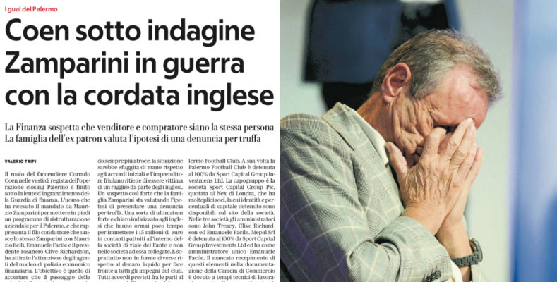 L’edizione odierna de “La Repubblica” analizza il caos attorno al Palermo, con l’indagine avviata dalla Guardia di Finanza nei confronti di Corrado Coen, mediatore nel closing per l’acquisizione della società rosanero. Ecco quanto riportato: “Il ruolo del faccendiere Corrado Coen nelle vesti di regista dell’operazione closing Palermo è finito sotto la lente d’ingrandimento della Guardia di finanza. L’uomo che ha ricevuto il mandato da Maurizio Zamparini per mettere in piedi un programma di ristrutturazione aziendale per il Palermo, e che rappresenta il filo conduttore che unisce lo stesso Zamparini con Maurizio Belli, Emanuele Facile e il presidente rosanero Clive Richardson, ha attirato l’attenzione degli agenti del nucleo di polizia economico finanziaria. L’obiettivo è quello di accertare che il passaggio delle azioni della società rosanero sia stato effettivamente compiuto e non rappresenti una cessione fittizia con la creazione di una rete che avrebbe dovuto mettere al sicuro la società di viale del Fante da eventuali sviluppi delle inchieste che hanno portato Zamparini ai domiciliari […] Il sospetto di chi indaga è che acquirente è compratore siano le stesse persone”.