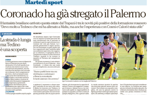 «In questo momento il mio obiettivo è giocare in A con il Palermo – dice Coronado – è chiaro che uno vuole sempre migliorare, ma sono abituato a godermi il momento e alzare sempre l’asticella di una tacca alla volta. A Malta ho lavorato con Tedesco, in Italia sono arrivato a Trapani e ho trovato Cosmi e poi Calori: da tutti ho imparato qualcosa. Non ho avuto tantissimi allenatori nel corso della mia carriera, però ho sempre cercato di capire da tutti cosa volessero da me in campo e come potevo darglielo. Sul piano umano tutti mi hanno trasmesso qualcosa: se devo fare un nome dico Tedesco, per me merita di allenare in campionati più importanti».