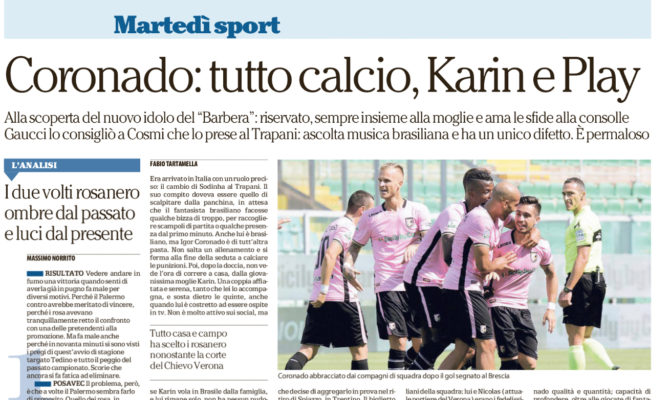 “Era arrivato in Italia con un ruolo preciso: il cambio di Sodinha al Trapani. Il suo compito doveva essere quello di scalpitare dalla panchina, in attesa che il fantasista brasiliano facesse qualche bizza di troppo, per raccogliere scampoli di partita o qualche presenza dal primo minuto. Anche lui è brasiliano, ma Igor Coronado è di tutt’altra pasta. Non salta un allenamento e si ferma alla fine della seduta a calciare le punizioni. Poi, dopo la doccia, non vede l’ora di correre a casa, dalla giovanissima moglie Karin. Una coppia affiatata e serena, tanto che lei lo accompagna, e sosta dietro le quinte, anche quando lui è costretto ad essere ospite in tv. Non è molto attivo sui social, ma se Karin vola in Brasile dalla famiglia, e lui rimane solo, non ha nessun pudore a postare le sue foto con lei, commentate con tanto di “mi manchi”. Insomma, un romantico che non fa nulla per nascondere di esserlo. Roba d’altri tempi. È stato Serse Cosmi, quando allenava a Trapani, a farsi convincere a portarlo in Italia: la famiglia Gaucci gli aveva segnalato questo ragazzo sudamericano, reduce da tre stagioni nel Floriana allora allenato da Giovanni Tedesco: 63 presenze e 32 gol nel campionato maltese. Certo, non un palcoscenico di primo livello, ma qualcosa induceva Alessandro Gaucci a pensare che le doti di questo ragazzo fossero adatte anche per il calcio italiano. Automatica scattò la telefonata a Cosmi, che decise di aggregarlo in prova nel ritiro di Spiazzo, in Trentino. Il biglietto di presentazione di Coronado fu subito convincente: suo, infatti, il gol della vittoria nell’amichevole contro il Verona. Da li in poi, non si è più fermato, e sono nate due stagioni in maglia granata che lo hanno definitivamente lanciato. Cosmi ha impiegato Coronado nel ruolo di trequartista, ma anche da esterno o da mezzala, ricevendo sempre ottime risposte sul campo e nessun problema fuori. Fin troppo sereno il comportamento di questo ragazzo, sostanzialmente silenzioso e riservato. Accetta lo scherzo in trasferta, ascolta immancabilmente musica brasiliana, ma difficilmente lo si incontra a cenare fuori. A Trapani, lo faceva con il nucleo di brasiliani della squadra: lui e Nicolas (attuale portiere del Verona) erano i fedelissimi di un gruppo che amava ritrovarsi a parlare portoghese davanti ad una pizza o al buon pesce. La scorsa estate, lo aveva puntato il Chievo, e il sogno di giocare in serie A era diventato la sua dolce ossessione. Quando il Palermo ha bussato alla porta, però, non ha esitato un attimo: era la maglia rosanero quella che voleva con tutte le sue forze, e i tentennamenti estivi sul “closing” mai perfezionato non gli hanno mai fatto cambiare idea. Ha preso casa a Mondello, diventata ovviamente il suo rifugio. Il difetto? È un po’ permaloso. Tedino avrà già sicuramente scoperto che se lo coccolerà e lo terrà sempre in considerazione, otterrà da Coronado qualità e quantità; capacità di profondere, oltre alle giocate di fantasia, anche sacrifici importanti per i compagni. Essere criticato o messo in discussione è un meccanismo che subisce, lo induce ad intristirsi. È forse questo l’ultimo, e più rilevante, salto di qualità che deve compiere, per affermarsi anche a livello più alto: la fortificazione del carattere. È la gioia di giocare a calcio il tratto distintivo della sua personalità. Tanto che il suo principale hobby è la Playstation. Il gioco preferito? Fifa, naturalmente: qualche avversario online da sfidare e battere c’è sempre. Proprio come accade tutte le volte che scende in campo e ne affronta uno vero”.