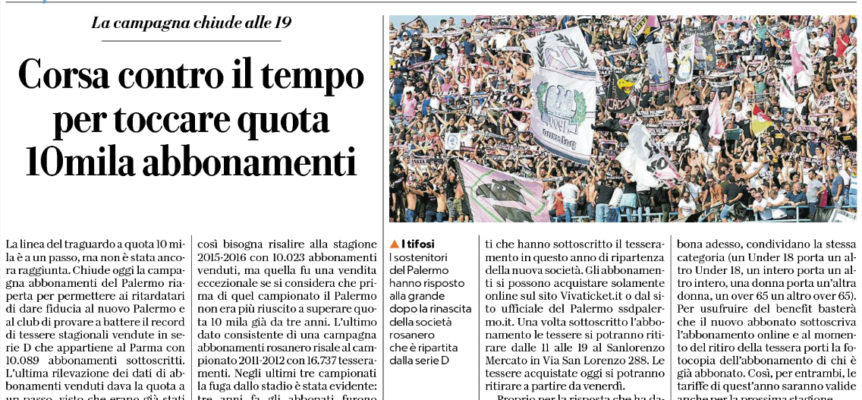 L’edizione odierna de “La Repubblica” si sofferma sulla campagna abbonamenti del Palermo. La linea del traguardo a quota 10 mila è ad un passo. Il record appartiene al Parma con 10.089 abbonamenti, mentre l’ultima rilevazione degli abbonamenti rosanero si fermava a quota 9.700. Per tornare ad avere un dato simile bisogna risalire alla stagione 2015-2016 con 10.023 abbonati. Negli ultimi tre campionati la fuga dallo stadio è stata evidente: tre anni fa gli abbonati furono 6.323, due anni fa 2.063 e l’anno scorso 2.210. Fino alle 19 di oggi gli abbonamenti si possono acquistare solamente online sul sito Vivaticket. it o dal sito ufficiale del Palermo ssdpalermo. it. Una volta sottoscritto l’abbonamento le tessere si potranno ritirare dalle 11 alle 19 al Sanlorenzo Mercato in Via San Lorenzo 288. Le tessere acquistate oggi si potranno ritirare a partire da venerdì. Proprio per la risposta che ha dato la tifoseria in termini di abbonamenti, la società ha deciso di affiancare alle riduzioni previste per under 18, over 65 e donne anche l’iniziativa ” Porta un’aquila”. Chi è già proprietario di abbonamento e porta un nuovo abbonato usufruirà insieme al nuovo sottoscrittore della tariffa bloccata per la prossima stagione. La condizione prevista dal club rosanero per riconoscere il ruolo di ambasciatore rosanero è che i due, chi si è già abbonato e chi si abbona adesso, condividano la stessa categoria ( un Under 18 porta un altro Under 18, un intero porta un altro intero, una donna porta un’altra donna, un over 65 un altro over 65). Per usufruire del benefit basterà che il nuovo abbonato sottoscriva l’abbonamento online e al momento del ritiro della tessera porti la fotocopia dell’abbonamento di chi è già abbonato. Così, per entrambi, le tariffe di quest’anno saranno valide anche per la prossima stagione. I prezzi sono decisamente più bassi rispetto alla scorsa stagione e anche rispetto alla maggioranza delle campagne abbonamenti della serie D e vanno da 70 euro per le curve a 1.000 euro per la tribuna sostenitori. Gli sconti previsti sono per donne e over 65 ( con prezzi che vanno da 50 euro per le curve a 200 euro per la centrale) e Under 18 ( prezzi da 17 euro per le curve a 200 euro per la tribuna sostenitori).
