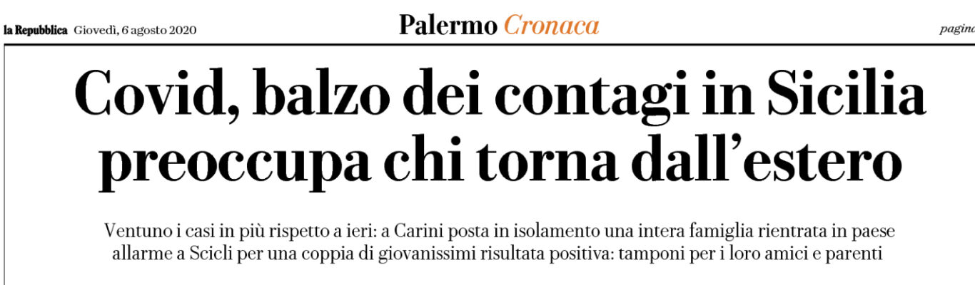 L’edizione odierna di “Repubblica” parla del bazza dei contagi in Sicilia. L’ultimo bollettino diffuso dal ministero della Salute parla di 21 casi in più.