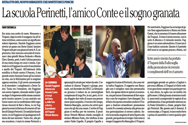 “Era stata una scelta di cuore. Rimanere a Trapani, dopo la serie A scappata via all’ultimo rettilineo, aveva avuto un significato: volerci riprovare. Daniele Faggiano aveva stretto un passo con Serse Cosmi: lasciare Trapani solo per una piazza di serie A. E, soprattutto, fare mercato cercando di trattenere i due gioielli: Bruno Petkovic e Nicola Citro. Questa, però, è solo l’ultima puntata di una storia lunga tre anni e mezzo, il periodo in cui Faggiano ha unito il suo destino a quello del Trapani. All’indomani della sconfitta in finale contro il Pescara, il suo grande amico Antonio Conte gli ha inviato un sms, con le felicitazioni per la stagione appena conclusa. E gli aveva raccomandato di estendere i complimenti a Serse Cosmi. Tanta era l’emozione, che Faggiano non aveva risposto, dovendo subire il giorno dopo il rimprovero dello stesso commissario tecnico azzurro. La sua amicizia con Conte nasce con la condivisione delle esperienze vincenti di Bari e Siena, in cui Faggiano ha avuto la fortuna di crescere all’ombra di Giorgio Perinetti. Un sodalizio funzionante, in cui Faggiano si è guadagnato la fiducia del suo mentore. Tanto che, alla prima occasione, è stato lo stesso Perinetti a spianargli la strada per volare da solo. L’occasione si chiama Trapani e giunge, puntuale, nel dicembre del 2012. La formazione granata è reduce da un meraviglioso campionato di Lega Pro, in cui, però, si è vista sfuggire due volte di mano una promozione quasi acquisita. Il tecnico del tempo, Roberto Boscaglia, accetta che arrivi qualcuno che gli dia una mano. L’arrivo di Faggiano si verifica per vie traverse. Il presidente Vittorio Morace chiede consiglio al sindaco Mimmo Fazio, che telefona al suo amico Fabio Capello. È proprio Capello a