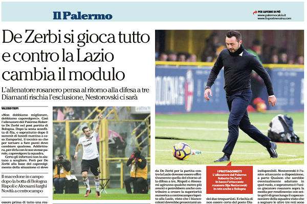 “«Non dobbiamo migliorare, dobbiamo capovolgerci». Così l’allenatore del Palermo Roberto De Zerbi nel post partita di Bologna. Dopo la sesta sconfitta di fila, e soprattutto dopo il summit di lunedì mattina a casa Zamparini, il tecnico sa che per tornare a fare punti deve cambiare qualcosa. Addirittura, per dirla con le sue stesse parole, capovolgere la squadra. Certo gli infortuni non lo aiutano a scegliere. Però per De Zerbi alla base del capovolgimento della situazione ci deve essere prima di tutto una reazione mentale. La prima mossa per invertire la tendenza dovrebbe essere quella di partire dagli ultimi minuti della partita di Bologna e segnare quindi il ritorno alla difesa a tre. Un accorgimento già preso anche dopo la partita di Pescara contro il Crotone e che ha portato alcune certezze in più sin dalla successiva partita di Bergamo, unica vittoria stagionale in campionato. Davanti al portiere Posavec le alternative non sono tantissime e a Bologna si sono fermati pure Cionek e Hiljemark. In attesa di capire se il polacco potrà essere disponibile, in questo momento gli arruolabili sono Vitiello, Goldaniga e Andelkovic. Se la strada intrapresa da De Zerbi per la partita contro la Lazio dovesse essere effettivamente quella del ritorno alla difesa a tre, Rispoli e Aleesami agiranno qualche metro più avanti e potrebbero anche contribuire a creare la superiorità numerica a centrocampo rispetto alla Lazio, visto che i biancocelesti dovrebbe presentarsi anche a Palermo con il 4-3-3. Fra gli interni in mezzo al campo potrebbe rivedersi dal primo minuto Chochev nel caso in cui Hiljemark non dovesse recuperare in tempo. Cerca una maglia da titolare anche Jajalo, uno dei giocatori della scuderia del consulente presidenziale Curkovic, che rischia di entrare in ballottaggio con Gazzi. Anche se non è da escludere un centrocampo tutto interdizione con l’ex torinista e Jajalo. Bruno Henrique, autore del pressing decisivo per recuperare palla e servire Nestorovski in occasione del momentaneo vantaggio rosanero a Bologna, nelle intenzioni di De Zerbi potrebbe anche fare l’incursore sulla linea