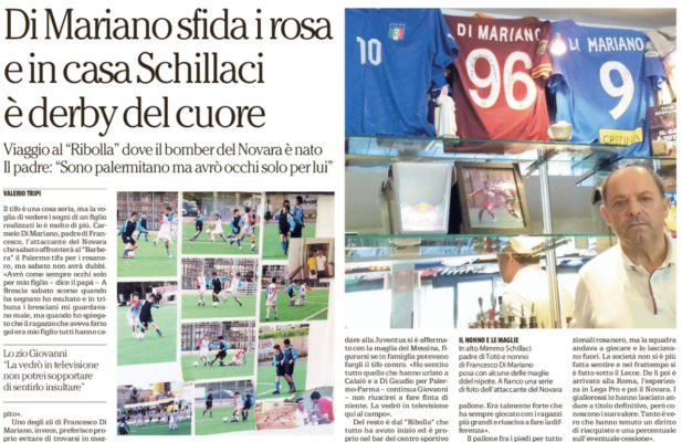 “Il tifo è una cosa seria, ma la voglia di vedere i sogni di un figlio realizzati lo è molto di più. Carmelo Di Mariano, padre di Francesco, l’attaccante del Novara che sabato affronterà al “Barbera” il Palermo tifa per i rosanero, ma sabato non avrà dubbi. «Avrò come sempre occhi solo per mio figlio – dice il papà – A Brescia sabato scorso quando ha segnato ho esultato e in tribuna i bresciani mi guardavano male, ma quando ho spiegato che il ragazzo che aveva fatto gol era mio figlio tutti hanno capito». Uno degli zii di Francesco Di Mariano, invece, preferisce proprio evitare di trovarsi in mezzo a questo tipo di situazioni e nonostante il nipote continui a chiedergli di andare allo stadio sabato, lui non ci sarà. «Il Palermo viene prima di tutto – spiega Giovanni Schillaci – simpatizzo pure per l’Inter, ma è normale che se tuo nipote gioca contro i rosanero per te non sarà mai un avversario. Mio cognato a Brescia ha spiegato la situazione, io invece non sopporterei sentire che un palermitano offende un suo concittadino solo perché indossa una maglia diversa da quella della squadra della sua città». Suo fratello Totò prima di andare alla Juventus si è affermato con la maglia del Messina, figurarsi se in famiglia potevano fargli il tifo contro. «Ho sentito tutto quello che hanno urlato a Calaiò e a Di Gaudio per Palermo- Parma – continua Giovanni – non riuscirei a fare finta di niente. La vedrò in televisione qui al campo». Del resto è dal “Ribolla” che tutto ha avuto inizio ed è proprio nel bar del centro sportivo che c’è una sorta di museo di Totò Schillaci accanto al quale sta sorgendo quello di Di Mariano. Ci sono le maglie delle squadre di club in cui hanno giocato zio e nipote, le maglie della nazionale, i ritagli di giornale e le fotografie. Nonno Mimmo Schillaci, il papà di mamma Rosalia, gli ha visto tirare i primi calci al pallone a tre anni. «Stava tutto il giorno qui al campo – racconta lo zio Giovanni – ha respirato sempre aria di calcio ed è cresciuto con il pallone fra i piedi. Una volta la Nike è venuta a fare uno stage con delle gare di abilità e lui ha vinto scarpe e pallone. Era talmente forte che ha sempre giocato con i ragazzi più grandi e riusciva a fare la differenza ». Il pallone fra i piedi per tutto il pomeriggio, ma anche a casa. «Ma non ha mai rotto nulla – dice il papà Carmelo – era bravo e palleggiava tutto il tempo. La palla non gli si allontanava mai dai piedi. E poi non è che abbia avuto chissà quanto tempo per rompere qualcosa a casa. A quattordici anni era già a Lecce. E a noi mancava tanto, infatti ogni due settimane andavamo a trovarlo». Oggi il Palermo sembra avere riaperto le porte ai giocatori palermitani. Ma fino a qualche tempo fa non era così. «A 13 anni – racconta il padre – era stato scelto per i giovanissimi nazionali rosanero, ma la squadra andava a giocare e lo lasciavano fuori. La società non si è più fatta sentire e nel frattempo si è fatto sotto il Lecce. Da lì poi è arrivato alla Roma, l’esperienza in Lega Pro e poi il Novara. I giallorossi lo hanno lasciato andare a titolo definitivo, però conoscono i suo valore. Tanto è vero che hanno tenuto un diritto di riacquisto e una percentuale sull’eventuale cessione». A Novara si trova bene, la serie B non è un passo indietro rispetto alla Roma, anzi per Di Mariano è la possibilità di giocare con continuità. «Ha un obiettivo chiaro in testa – dice lo zio Giovanni – vuole giocare in serie A. Gli erano arrivate anche offerte molto vantaggiose dal Giappone, ma lui ha preferito mettersi in gioco qui. Io sarei andato al volo, ma lui mi ha detto “non ho 30 anni, ho una carriera davanti e voglio giocare in serie A”. È molto ambizioso, ma chiede sempre consigli e ascolta molto»”. Questo quanto riportato dall’edizione odierna de “La Repubblica”.