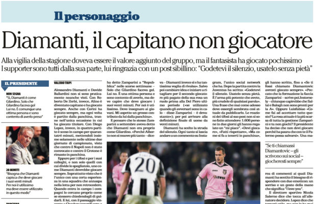 Repubblica: “Diamanti, il capitano non giocatore: «Godetevi il silenzio, usatelo senza pietà»”