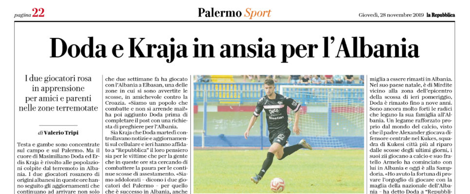 L’edizione odierna de “La Repubblica” si sofferma su Doda e Kraja, calciatori del Palermo, che hanno manifestato solidarietà all’Albania, terra d’origine colpita dal terremoto degli ultimi giorni. Nei minuti successivi alle prime scosse Doda su Instagram ha pubblicato una storia con un messaggio rivolto ai connazionali: «Spero che stiate tutti bene. Siamo un popolo che combatte e non si arrende mai!». «Siamo addolorati – dicono i due giocatori del Palermo – per quello che è successo in Albania, anche a distanza siamo vicini con il cuore alla gente che sta soffrendo».