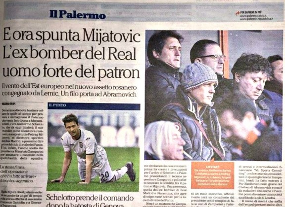 “Il vento dell’Est europeo nel nuovo assetto rosanero consegnato da Lemic. Un filo ad Abramovich”. Questo scrive l’edizione odierna de “La Repubblica” in merito al nuovo assetto societario in quel di viale del Fante. Il quotidiano poi continua: “Domenica a Genova bastava voltare le spalle al campo per provare a immaginare il Palermo che verrà. In tribuna a Marassi infatti, c’era Guillermo Schelotto che da oggi inizierà il suo mandato come allenatore rosanero ma soprattutto Pedrag Mijatovic , ex direttore sportivo del Real Madrid e prossimo dirigente del club di viale del Fante. E’ lui infatti l’uomo scelto da Zamparini per assumere il controllo della quotidianità della squadra. Quella figura che il patron andava cercando da un po’ di tempo e che aveva offerto al suo amico Francesco Guidolin e Giovanni Trapattoni. In pochi metri domenica a Genova c’erano anche gli artefici di questo nuovo matrimonio, quei consulenti di mercato, agenti Fifa e mediatori che da qualche tempo a questa parte hanno preso sempre più spazio […]”