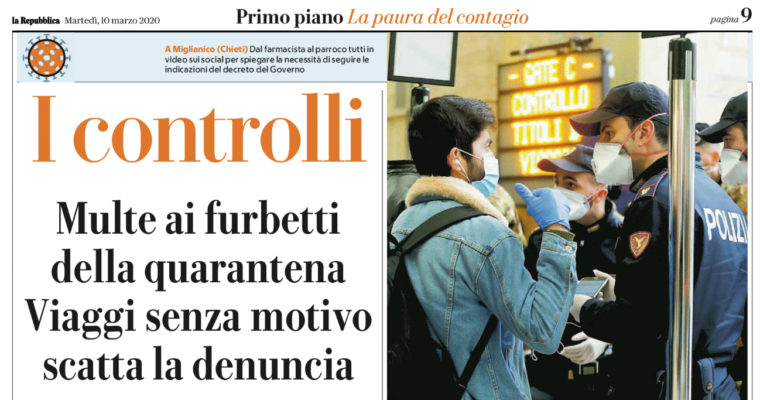 Repubblica: “Emergenza Coronavirus. I controlli, multe ai furbetti della quarantena. Viaggi senza motivo, scatta la denuncia”