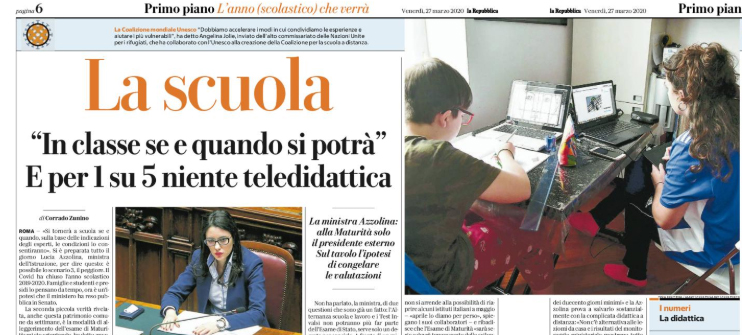 Repubblica: “Emergenza Coronavirus. La scuola «In classe se e quando si potrà». E per 1 su 5 niente teledidattica”