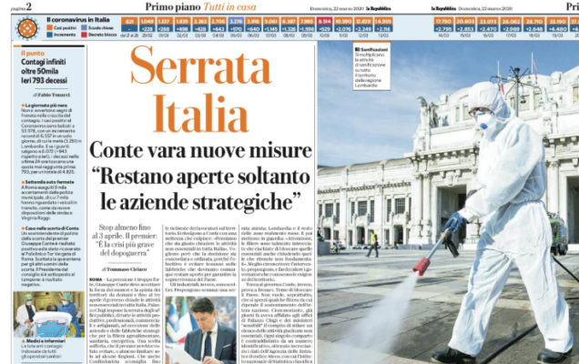 Repubblica: “Emergenza Coronavirus. Serrata Italia. Italiani in casa fino al 19 aprile? I dettagli”