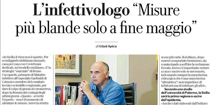 Repubblica: “Emergenza Coronavirus. Sicilia. L’infettivologo «Misure più blande solo a fine maggio»”