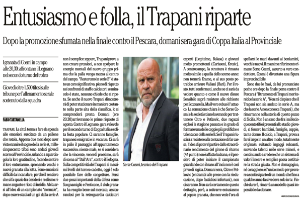 “La città torna a fare da sponda alle emozioni suscitate da un pallone che rotola. Appena due mesi dopo aver visto svanire il sogno della serie A, millecinquecento tifosi sono andati giovedì scorso al Provinciale, urlando a squarciagola la loro gratitudine, facendo sentire il loro entusiasmo, spronando vecchi e nuovi granata alla lotta. Sono emozioni difficili da incanalare, perché il sentiero che si fa spazio fra desideri e realismo rimane angusto e ricco di insidie. Abituarsi all’idea di un campionato “normale”, dopo essere stati ad un gol dalla serie A non è semplice: eppure, Trapani prova a non creare pressioni, a non spolpare le energie mentali del nuovo gruppo prima che la palla venga mezza al centro del campo. “Resteremo in serie B” è stato un coro significativo, pieno di rispetto nei confronti di staff e calciatori: se miracolo è stato, nessuno chiede che si ripeta. Se anche il nuovo Trapani dimostrerà di poter stazionare in maniera costante nella parte alta della classifica, lo si comprenderà presto. Domani (ore 20.30)arriveranno le prime risposte di agosto. Contro il Legnano, gara valevole per il secondo turno di Coppa Italia e solita festa popolare. Ci saranno famiglie, trapanesi emigrati e in vacanza. Ci sarà in palio il passaggio all’appuntamento successivo: niente male, se si considera che la vincente, venerdì prossimo, sarà di scena al “Dall’Ara”, contro il Bologna. Sulla competitività del Trapani ai massimi livelli del torneo cadetto, oggi è solo possibile fare delle congetture. Persi due pezzi importanti della difesa come Scognamiglio e Perticone, il club granata ha reagito bene sul mercato, assicurandosi per la retroguardia calciatori esperti (Legittimo, Balasa) e giovani molto promettenti (Carissoni, Kresic). A centrocampo, la struttura è rimasta molto simile a quella dello scorso anno: non tornerà Eramo, e al suo posto potrebbe arrivare Valiani (Bari). Per il resto, tutti confermati, anche se ci sarà da vedere quanto e come il nuovo diesse Sensibile saprà resistere alle richieste per Scozzarella. Ma il vero rebus è l’attacco. La sensazione chiara è che Serse Cosmi e la società stiano lavorando per trattenere Citro e Petkovic, due ragazzi esplosi la stagione passata e in grado di formare una delle coppie più prolifiche e talentuose della serie B. Se il Trapani riuscirà a resistere alla tentazione di far cassa, l’idea di poter ripartire dallo straordinario rendimento del girone di ritorno (44 punti) non è affatto balzana, e il pensiero di poter iniziare il campionato guardando con il naso all’insù non è così privo di logica. Domani sera, Citro e Petkovic (entrambi alle prese con la rieducazione, dopo fastidiosi infortuni), non ci saranno. Non sarà certamente questo dettaglio, però, a sottrarre entusiasmo al popolo granata, che non vede l’ora di spellarsi le mani davanti ai beniamini, vecchi e nuovi. Il massimo riferimento rimane Serse Cosmi, assurto a vero condottiero. Cosmi è diventato una figura imprescindibile. Sono due le frasi, da lui pronunciate poche ore dopo la finale persa contro il Pescara (“Il tramonto di Trapani meriterebbe la serie A”, “Non mi dispiace che il Trapani non sia andato in serie A, ma che la serie A non conosca Trapani), che rimarranno nella storia di questo pezzo di Sicilia. Non è un caso che fra i millecinquecento tifosi presenti allo stadio giovedì, ci fossero bambini, famiglie, coppie, tante donne. Il calcio, a Trapani, prova a farsi largo in un altro modo, totalmente originale: evitando ingaggi roboanti, scovando talenti nelle serie minori, e continuando a credere che un sistema di valori lineare e semplice possa costituire la strada giusta. Non è demagogico, né coraggioso: è l’unico modo per provare a sentirsi parte di un mondo che fino a qualche anno fa si vedeva solo in tv. Finché durerà, rimarrà un modello quasi impossibile da clonare”. Questo quanto si legge sull’edizione odierna de “La Repubblica”.