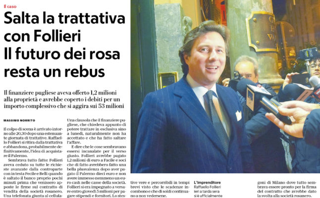 “Il colpo di scena è arrivato intorno alle 20,30 dopo una estenuante giornata di trattative. Raffaello Follieri si ritira dalla trattativa e abbandona, probabilmente definitivamente, l’idea di acquistare il Palermo. Sembrava tutto fatto: Follieri aveva ceduto su tutte le richieste avanzate dalla controparte con in testa Fecile e Belli quando è saltato il banco proprio pochi minuti prima che venissero apposte le firme sul contratto di vendita della società rosanero. Una telefonata giunta al cellulare di Emanuele Facile ha fatto cambiare idea all’amministratore delegato del Palermo che, sostenendo di avere un’altra trattativa della quale sino a quel momento non aveva fatto menzione, ha chiesto di firmare il preliminare di vendita, ma senza concedere l’esclusiva al gruppo Follieri. In pratica, in attesa del passaggio delle azioni davanti al notaio previsto per lunedì alle 18, i proprietari del Palermo avrebbero potuto avere la possibilità di trattare ancora con altri soggetti rendendo di fatto carta straccia il contratto firmato da Follieri. Una clausola che il finanziere pugliese, che chiedeva appunto di potere trattare in esclusiva sino a lunedì, naturalmente non ha accettato e che ha fatto saltare l’affare. E dire che le cose sembravano essersi incanalate per il verso giusto. Follieri avrebbe pagato 1,2 milioni di euro a Facile e soci che di fatto avrebbero fatto una bella plusvalenza dopo aver pagato il Palermo dieci euro e non avere immesso nemmeno un euro cash nelle casse della società. Follieri si era impegnato a versare entro giovedì 5 milioni per pagare stipendi e fornitori. Lo stesso finanziere aveva mostrato una evidenza fondi di 23,8 milioni e si sarebbe inoltre accollato il debito di 22,8 di Alyssa e quello di 15 milioni per i procuratori. Un’operazione che alla fine sarebbe costata a Follieri 52 milioni e 750 mila euro. Soldi che a Facile e soci non sono bastati”.