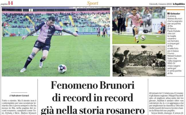 «Stadio vu Tutto o niente. Ma il niente non è contemplato per uno scorpione testardo che ci prova sempre e che ha messo in fila, nella pagina dei record rosanero, campioni come Toni, Dybala e Ilicic. Matteo Brunori sta vivendo un periodo esaltante, probabilmente quella della definitiva maturazione, e vuole continuare a stupire. Da inizio anno, sono otto i gol all’attivo, nessuno in Italia ha fatto meglio di lui da Vlahovic, a Immobile, da Simeone a Abraham, almeno in A e in B (Ganz del Lecco ne ha realizzati due in più ma con dieci gare a disposizione).