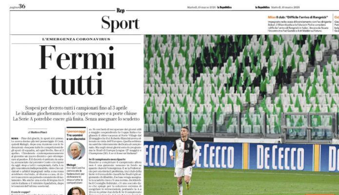 L’edizione odierna de “La Repubblica” si sofferma sullo stop dei campionati. Lo aveva deciso già ieri pomeriggio il Coni, quindi Malagò, dopo una riunione con le federazioni: «Sospese tutte le competizioni degli sport di squadra, ad ogni livello, fino al 3 aprile». Chiedendo contemporaneamente al governo un nuovo decreto «per ottemperare al punto». È il decreto è arrivato in serata, annunciato dal premier Conte e in vigore da oggi: stop a tutti i campionati, dalla A in giù: una misura indispensabile, visto che calciatori o arbitri impegnati nella zona rossa avrebbero rischiato, al ritorno a casa, di dover trascorrere un periodo consistente di isolamento. Ma anche una sorta di tregua tra il calcio italiano e il ministro Spadafora, dopo le tensioni dell’ultimo weekend. I club italiani di calcio, invece, potranno utilizzare gli stadi, sempre ovviamente a porte chiuse, per giocare le gare europee «già fissate». Oggi il Consiglio federale dovrà affrontare soprattutto un’altra questione chiave: come costruire il nuovo calendario? Lo stop forzato da qui al 3 aprile farà saltare almeno tre giornate di Serie A, 27ª, 28ª e 29ª giornata, e i tre recuperi della 25ª in programma il 18 marzo. Si cercherà di recuperare dei giorni utili a maggio: sospendendo la Coppa Italia e tagliando il ritiro-vacanza al Forte Village dal 25 maggio che il ct Roberto Mancini aveva ottenuto in vista dell’Europeo. Quella settimana sarebbe interamente dedicata al campionato. Ma negli stessi giorni sono in programma le finali di Europa League (27 maggio) e Champions (30). E se ci fosse un’italiana? Riuscire a completare il campionato allora non è una garanzia: nessuno in fondo sa quanto durerà l’emergenza. E se la Federcalcio per ora rinvia il problema, tra i club della Serie A il tema delle classifiche finali è già argomento di dibattito. Escluso venga assegnato lo scudetto (non c’è una norma, deciderebbe il Consiglio federale), c’è uno zoccolo duro che spinge per la soluzione estrema di congelare le retrocessioni, portando la A a 22 con le prime due della B. Se il campionato finisce per decreto, la Lega di A non dovrà risarcire le tv. E per un’azienda con 4 miliardi di debito non è poco.