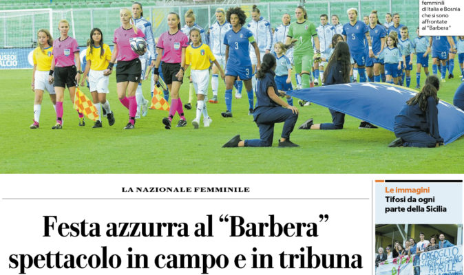 L’edizione odierna de “La Repubblica” esalta la sfida di calcio femminile tra Italia e Bosnia, che si è tenuta ieri al “Barbera”. In oltre cinquemila hanno riempito gradinata e tribuna. «Non potevo mancare – dice Mariella – prima il calcio femminile nemmeno si riusciva a vedere in televisione, adesso finalmente posso assistere a una partita nel mio stadio dove di solito guardo il Palermo». Il popolo del calcio femminile è variopinto: ci sono tutte le giocatrici delle squadre siciliane ognuna con i propri colori sociali. Ma anche semplici appassionate. «Fino a qualche anno fa – racconta Valentina – quando andavamo a giocare a calcetto eravamo viste come marziane. E non vi dico le battutine. Adesso nemmeno ci fanno più caso se fra un campo e l’altro giochiamo noi o una partita di maschietti. Almeno in questo un po’ di parità l’abbiamo guadagnata». In tribuna erano presenti anche Dario Mirri, Renzo Castagnini e Gianluca Paparesta. Una fila più in basso anche una delegazione di giocatori rosanero composta da Erdis Kraja, Mattia Fallani, Massimiliano Doda, Francesco Vaccaro, Lorenzo Bechini e Manuel Peretti. Presente anche la Ludos Palermo: «È il punto più alto mai raggiunto dal movimento – dice Antonella Licciardi – il cambio di passo rispetto al recente passato è netto e non solo per noi che abbiamo sempre fatto calcio femminile a Palermo, ma per tutto il movimento a livello nazionale. C’è visibilità e per noi è il riconoscimento di un lavoro di tantissimi anni».