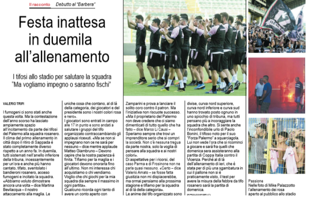 Nella giornata di ieri il Palermo ha sostenuto il suo primo allenamento in città. La prima seduta si è tenuta al “Renzo Barbera” dove si sono presentati circa 2000 tifosi che a differenza della scorsa stagione hanno sostenuto la squadra e non l’hanno contestata. Di seguito quanto scrive l’edizione odierna de la “Repubblica” proprio sull’allenamento di ieri: