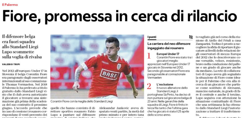 “Il difensore belga era fuori squadra allo Standard Liegi Lupo scommette sulla voglia di rivalsa. Nel 2012 all’europeo Under 17 in Slovenia il belga Corentin Fiore era paragonato dagli osservatori internazionali al suo connazionale Thomas Vermaelen. Nel 2018 il Palermo lo ha prelevato a titolo gratuito dallo Standard Liegi visto che il club aveva autorizzato il giocatore a trovarsi una sistemazione già prima della scadenza del suo contratto il prossimo giugno. L’accordo prevede che in caso di cessione i rosanero corrispondano il venti percento dei proventi di una eventuale cessione futura allo Standard Liegi. In mezzo, fra il 2012 e il 2018, ci sono le potenzialità inespresse, quelle su cui vuole fare leva il Palermo, e quelle che ha saputo mettere in mostra fino allo scorso 25 aprile, giorno della sua ultima partita da titolare con la maglia dello Standard Liegi. Proprio quelle che hanno convinto il direttore sportivo rosanero Fabio Lupo a puntare sul difensore mancino di origini italiane che compirà 23 anni a marzo. Il passato recente di Fiore è fatto di bocconi amari, mancate convocazioni e il terzo posto nella gerarchia del suo nuovo allenatore Ricardo Sá Pinto per i postumi di un infortunio. Eppure nella stagione precedente era nella rosa dei titolari, visto che sotto la guida di Aleksandar Jankovic aveva disputato venti partite, la metà dal primo minuto e per intero ( una anche in Europa League, competizione in cui l’anno scorso ha messo insieme quattro presenze). Poi un primo cambio di allenatore, altre due partite da titolare con il traghettatore Josè Jeunechamps, quindi la scelta di Sá Pinto di lasciarlo fuori dai giochi per questa stagione. Il nome di Corentin Fiore è stato vagliato già nel corso della riunione di Aiello del Friuli a casa Zamparini. Tedino è pronto a raccogliere la sfida di riportare il giocatore ai livelli delle relazioni degli osservatori di mezza Europa del 2012 che lo descrivevano come versatile, veloce, resistente, bravo nella conduzione del pallone e un grado di giocare anche da mediano. La rete di collaboratori di Lupo aveva già segnalato la situazione di Fiore come ideale per il Palermo che era alla ricerca di un giocatore che partisse come sostituto di Aleesami, mancino naturale, in grado di fare il centrale e anche il terzino. Lupo seguiva con attenzione la situazione contrattuale di Fiore che una settimana fa ha ottenuto dallo Standard Liegi l’autorizzazione a trattare il trasferimento. Il difensore è fuori da tutte le vecchie reti di consulenti e procuratori che hanno avuto rapporti con il Palermo fino a poco tempo fa. A curare la sua procura è la società francese Agence442 che per il mercato italiano si è appoggiata ai procuratori Matteo Materazzi e Paolo Tricoli”.