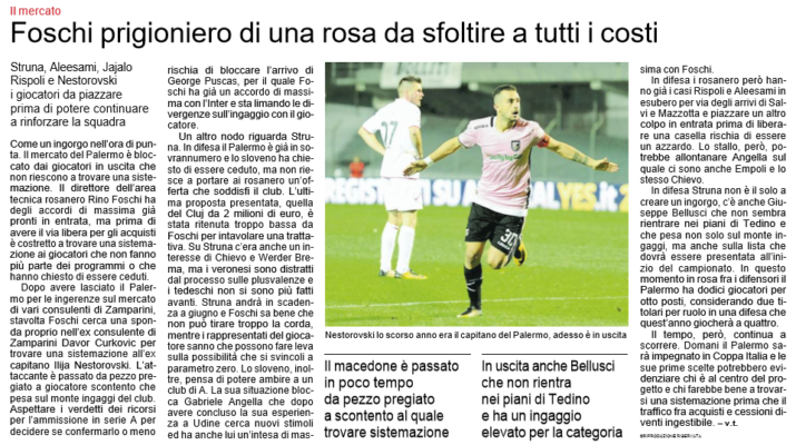 “Come un ingorgo nell’ora di punta. Il mercato del Palermo è bloccato dai giocatori in uscita che non riescono a trovare una sistemazione. Il direttore dell’area tecnica rosanero Rino Foschi ha degli accordi di massima già pronti in entrata, ma prima di avere il via libera per gli acquisti è costretto a trovare una sistemazione ai giocatori che non fanno più parte dei programmi o che hanno chiesto di essere ceduti. Dopo avere lasciato il Palermo per le ingerenze sul mercato di vari consulenti di Zamparini, stavolta Foschi cerca una sponda proprio nell’ex consulente di Zamparini Davor Curkovic per trovare una sistemazione all’ex capitano Ilija Nestorovski. L’attaccante è passato da pezzo pregiato a giocatore scontento che pesa sul monte ingaggi del club. Aspettare i verdetti dei ricorsi per l’ammissione in serie A per decidere se confermarlo o meno rischia di bloccare l’arrivo di George Puscas, per il quale Foschi ha già un accordo di massima con l’Inter e sta limando le divergenze sull’ingaggio con il giocatore. Un altro nodo riguarda Struna. In difesa il Palermo è già in sovrannumero e lo sloveno ha chiesto di essere ceduto, ma non riesce a portare ai rosanero un’offerta che soddisfi il club. L’ultima proposta presentata, quella del Cluj da 2 milioni di euro, è stata ritenuta troppo bassa da Foschi per intavolare una trattativa. Su Struna c’era anche un interesse di Chievo e Werder Brema, ma i veronesi sono distratti dal processo sulle plusvalenze e i tedeschi non si sono più fatti avanti. Struna andrà in scadenza a giugno e Foschi sa bene che non può tirare troppo la corda, mentre i rappresentati del giocatore sanno che possono fare leva sulla possibilità che si svincoli a parametro zero. Lo sloveno, inoltre, pensa di potere ambire a un club di A. La sua situazione blocca Gabriele Angella che dopo avere concluso la sua esperienza a Udine cerca nuovi stimoli ed ha anche lui un’intesa di massima con Foschi. In difesa i rosanero però hanno già i casi Rispoli e Aleesami in esubero per via degli arrivi di Salvi e Mazzotta e piazzare un altro colpo in entrata prima di liberare una casella rischia di essere un azzardo. Lo stallo, però, potrebbe allontanare Angella sul quale ci sono anche Empoli e lo stesso Chievo. In difesa Struna non è il solo a creare un ingorgo, c’è anche Giuseppe Bellusci che non sembra rientrare nei piani di Tedino e che pesa non solo sul monte ingaggi, ma anche sulla lista che dovrà essere presentata all’inizio del campionato. In questo momento in rosa fra i difensori il Palermo ha dodici giocatori per otto posti, considerando due titolari per ruolo in una difesa che quest’anno giocherà a quattro. Il tempo, però, continua a scorrere. Domani il Palermo sarà impegnato in Coppa Italia e le sue prime scelte potrebbero evidenziare chi è al centro del progetto e chi farebbe bene a trovarsi una sistemazione prima che il traffico fra acquisti e cessioni diventi ingestibile”.