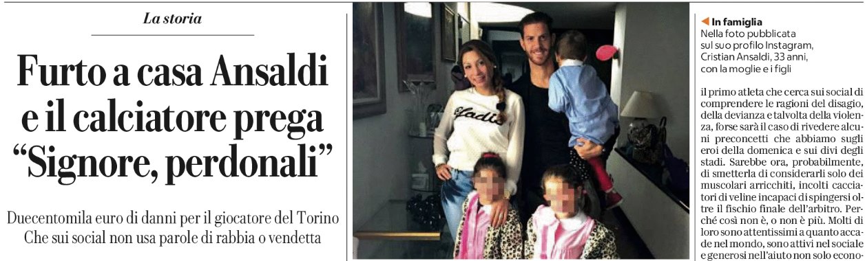 Repubblica: “Furto a casa di Ansaldi. Il calciatore prega: «Signore, perdonali»”