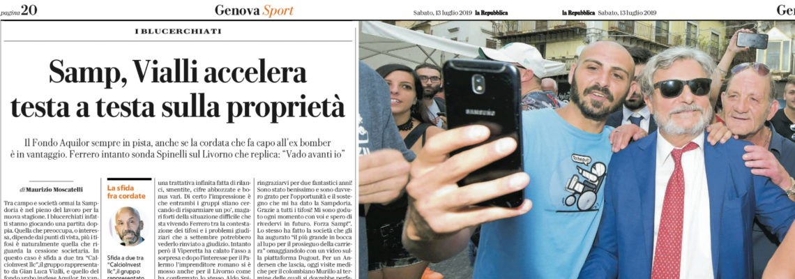 L’edizione odierna di “Repubblica” nella sua versione di Genova, parla ancora della cessione della Sampdoria. La sfida è sempre tra  “CalcioInvest llc”, gruppo rappresentato da Gian Luca Vialli, e quello del fondo arabo inglese Aquilor. L’ex bomber sarebbe attualmente in vantaggio, con Edoardo Garrone che sarebbe al lavoro dietro le quinte nonostante le smentite. Sembra che entrambi i gruppi stiano cercando di risparmiare un po’, forti della situazione che sta vivendo Ferrero. Il patron blucerchiato, oltre a quello per il Palermo, ha manifestato anche il proprio interesse nei confronti del Livorno, ma il patron Spinelli ha risposto: «Ferrero mi ha chiamato per il Livorno, ma andiamo avanti noi»