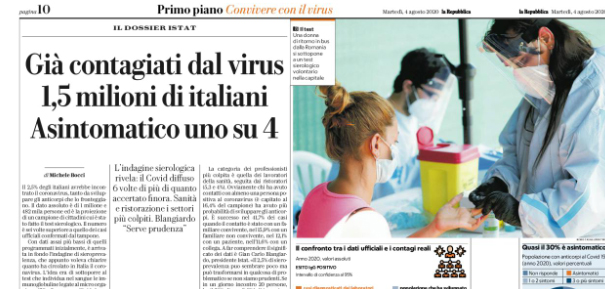 Repubblica: “Già contagiati dal virus 1,5 milioni di italiani. Asintomatico uno su 4”