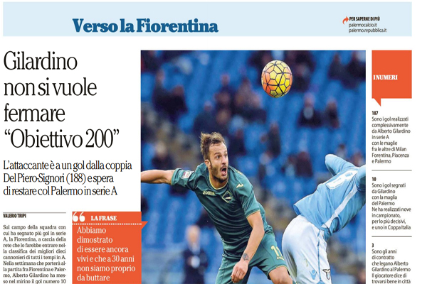“Sul campo della squadra con cui ha segnato più gol in serie A, la Fiorentina, a caccia della rete che lo farebbe entrare nella classifica dei migliori dieci cannonieri di tutti i tempi in A. Nella settimana che porterà alla partita fra Fiorentina e Palermo, Alberto Gilardino ha messo nel mirino il gol numero 10 della sua stagione in A. In maglia rosanero ha già tagliato il traguardo della doppia cifra grazie alla rete segnata in coppa Italia che si somma alle altre nove in campionato che stanno tenendo a galla il Palermo in questa stagione travagliata. A Frosinone ha segnato la rete del vantaggio festeggiato sotto la curva dei tifosi rosanero. A fine partita si è tolto un sassolino dalla scarpa messo da chi pensava che lui, a trentatré anni, fosse troppo vecchio per giocare in A. «Abbiamo dimostrato — ha detto l’attaccante a fine partita — che siamo ancora vivi, ma soprattutto siamo felici di avere dato risposte sul campo a ex allenatori ed ex giocatori. Nonostante i 30 anni e passa non siamo ancora da buttare». Contro la Sampdoria ha provato a farsi assegnare l’autogol di Krsticic, ma proprio non era possibile farlo. Per il gol numero 188 in serie A Gilardino deve aspettare ancora. Nella graduatoria dei marcatori di tutti i tempi del massimo campionato è fermo a quota 187, all’undicesima posizione, una rete dietro Beppe Signori e Alessandro Del Piero. A Firenze, in tre anni, è sempre andato in doppia cifra. «Il mio obiettivo — dice Gilardino alla rivista Undici — è superare quota 200. Perché so che se penso di farne 200 non ci arrivo: devo pensare di farne almeno 210. Sono un calciatore giovane. C’è gente che ha quattro, cinque anni più di me e sta giocando: questo mi tiene vivo, mi dà motivazioni. Credo di poter giocare ancora molto. Ho la stessa passione di quando ho iniziato, la stessa voglia di far gol e finché avrò queste sensazioni continuerò. Sono sereno ma so che c’è sempre da dimostrare. Ogni giorno. Nel calcio devi sempre dimostrare di voler far bene. Da quando hai 17 anni a quando ne hai 33: è sempre una rincorsa». In questi giorni, a parte le battute in diretta nel post partita di Frosinone, Gilardino ha preferito concentrarsi sul campo e non rilasciare interviste. Nemmeno in conferenza stampa. Nel periodo in cui tutti lo mettevano in discussione, ha preferito evitare i microfoni per non lasciare trasparire realmente le sensazioni che stava provando. L’unico strappo alla regola che si è dato è stata l’intervista al bisettimanale pubblicata ieri, ma realizzata a inizio marzo: proprio nel periodo più delicato della stagione rosanero, molto prima del gol al Frosinone che ha fatto scoppiare l’amore dei tifosi nei suoi confronti. E in quell’occasione le sue parole sono state al miele nei confronti della città e della tifoseria. «Palermo — dice l’attaccante — è una realtà assolutamente positiva: grande passione per il calcio, gente molto, molto buona. Io e la mia famiglia stiamo davvero bene, questa città ha tutto quello che si può desiderare per avere il miglior tenore di vita. La stagione è travagliata, ma stiamo lottando». Fra le squadre in cui ha giocato, la Fiorentina è stata per Gilardino quella con cui ha segnato più gol: 52 solo in campionato, ma ci sono state reti pesanti anche in Europa. «Il gol contro il Liverpool ad Anfield — racconta Gilardino — è stato il più importante della mia vita. Per lo stadio, per l’importanza della partita e per il calore che mi dava la gente di Firenze. Ma ce ne sono stati anche altri. Il gol col Milan in semifinale di Champions contro il Manchester United, per esempio, o quello al Mondiale contro gli Stati Uniti. Li ricordo tutti con gioia. Ogni tanto li vado a riguardare, soprattutto prima di qualche partita. Mi aiutano»”. Questo quanto si legge sull’edizione odierna de “La Repubblica”.